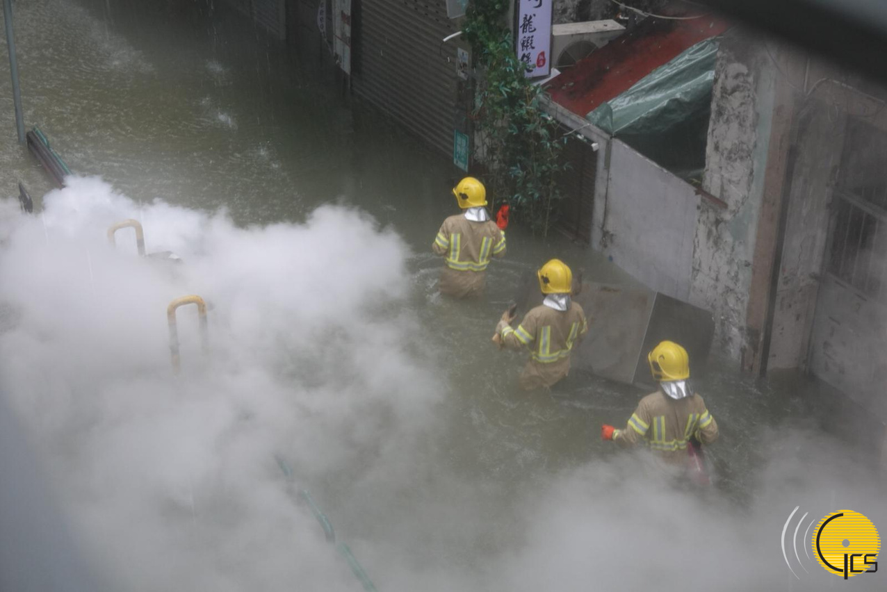 Pessoal das FSM, e de outros serviços, empenhado nos trabalhos de salvamento em várias zonas de Macau e continua a dar apoio aos trabalhos de evacuação.