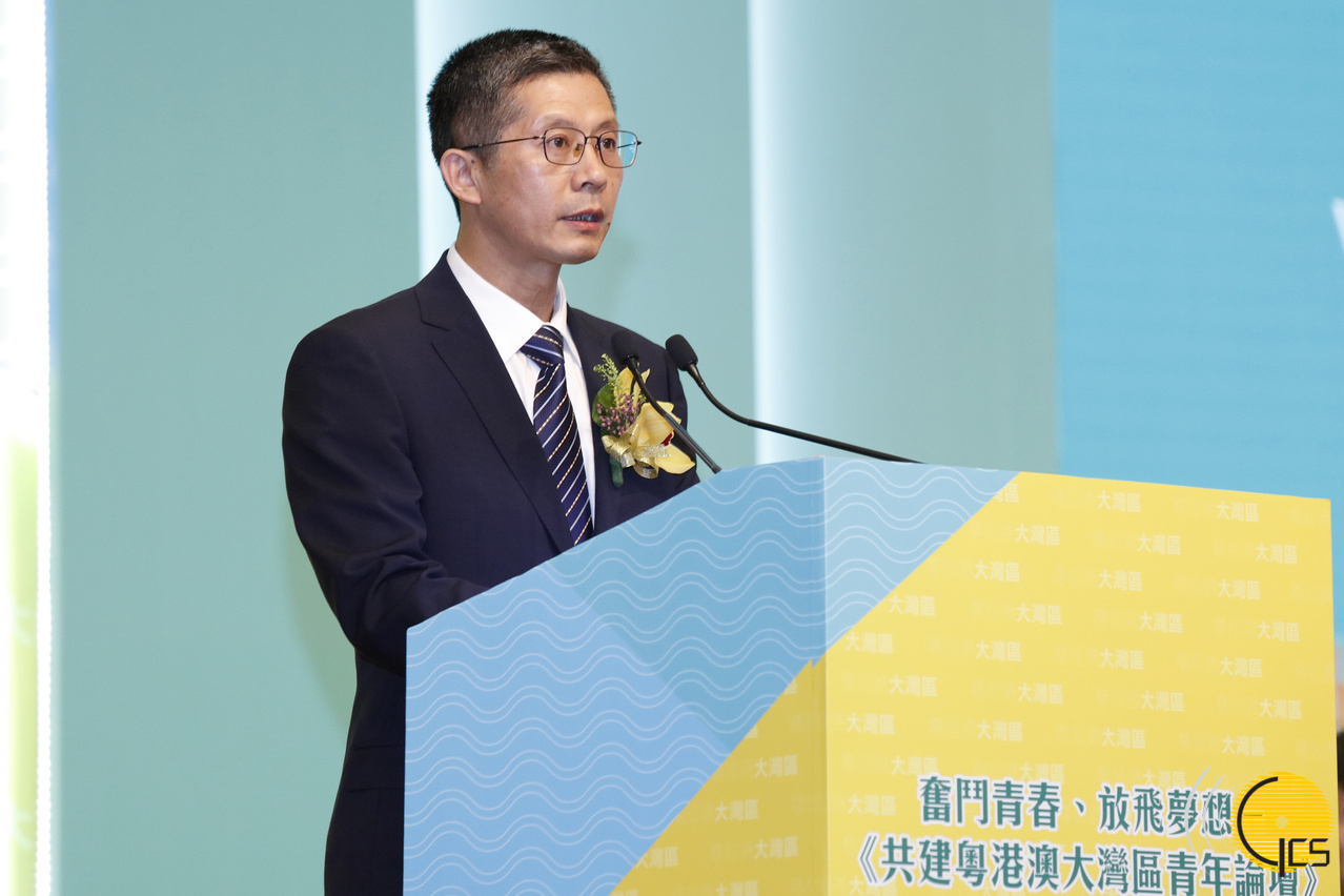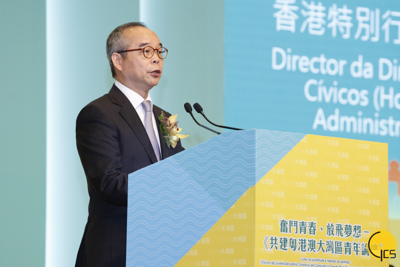 • Director dos Serviços dos Assuntos Cívicos (Home Affairs Bureau) da Região Administrativa Especial de Hong Kong, Lau Kong-wah, discursa na cerimónia de abertura do Fórum de Juventude sobre Construir em Conjunto a Grande Baía Guangdong – Hong Kong – Macau: Lutar na juventude e realizar os sonhos.