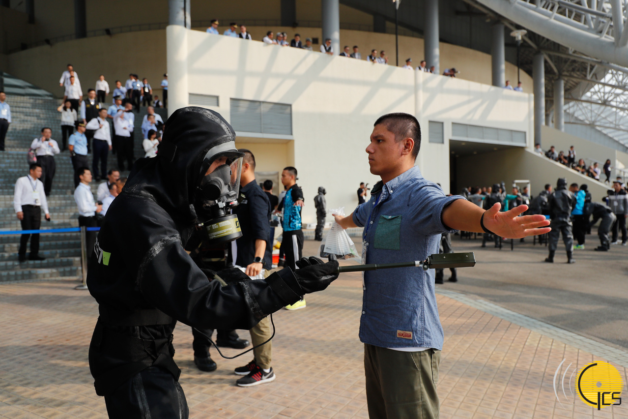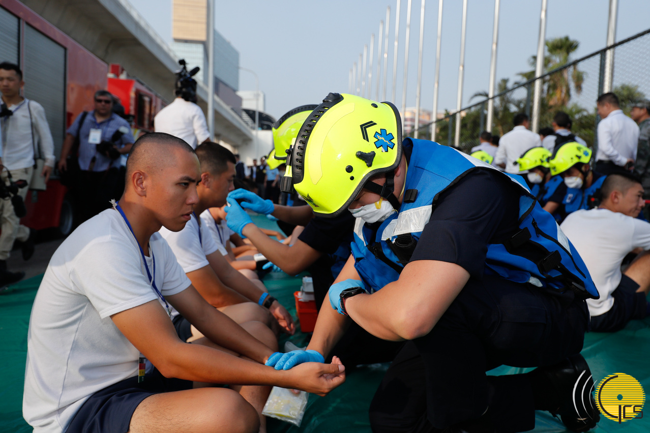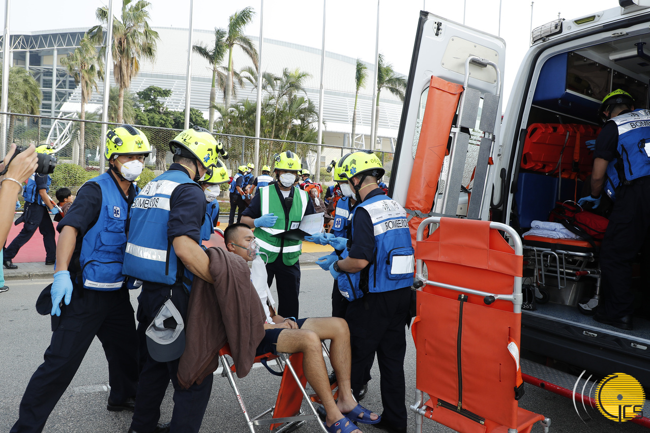 • Exercício de combate ao terrorismo Cão espirituoso: Elementos do Corpo de Bombeiros e da Guarnição do Exército do Povo Chinês em Macau evacuam a zona e procedem aos protocolos de descontaminação.