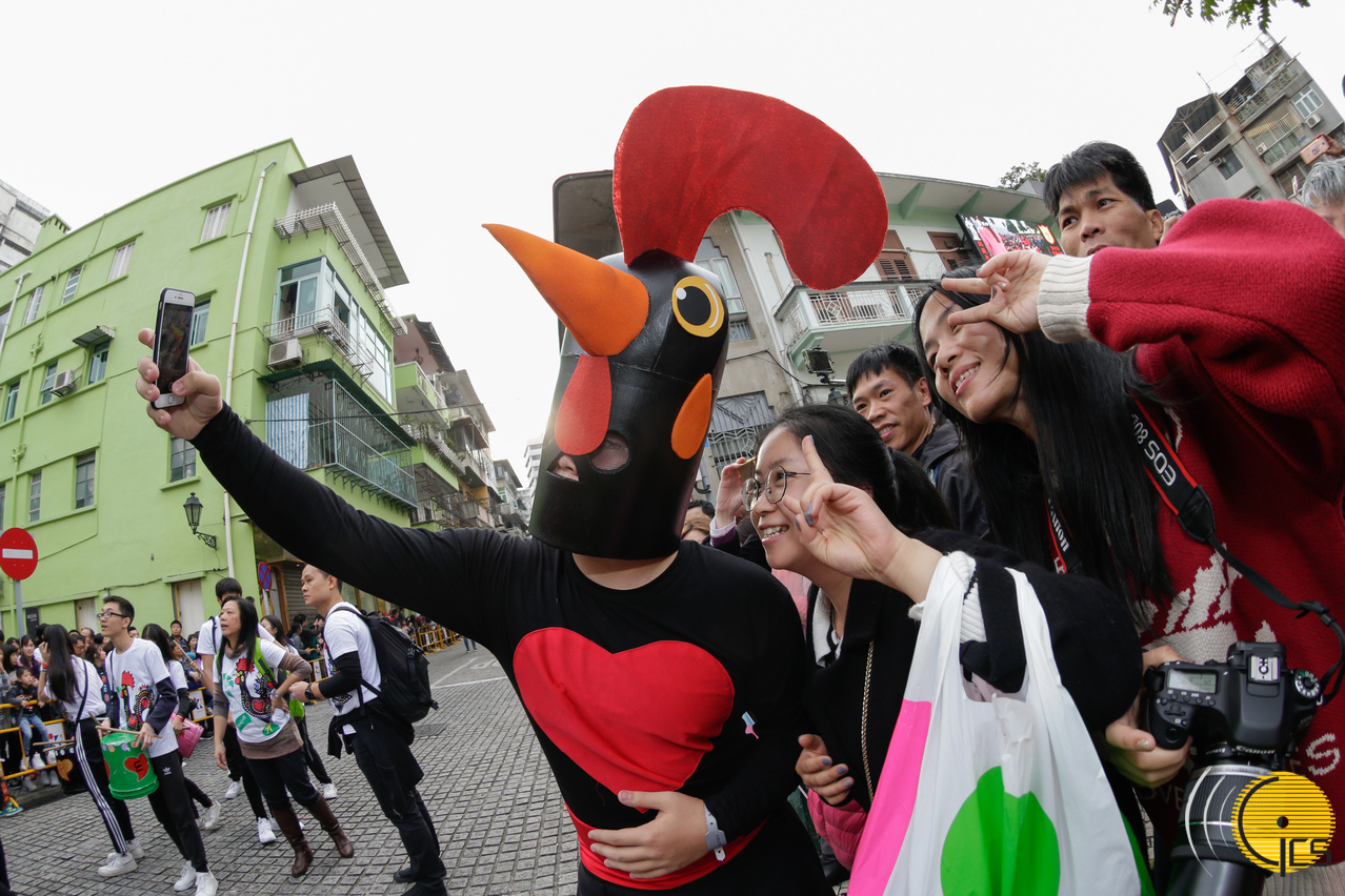 • O Largo de Sé é um dos pontos ao longo da rota do Desfile. Um artista vestido de Galo de Barcelos de Portugal tira uma «selfie» com o público.