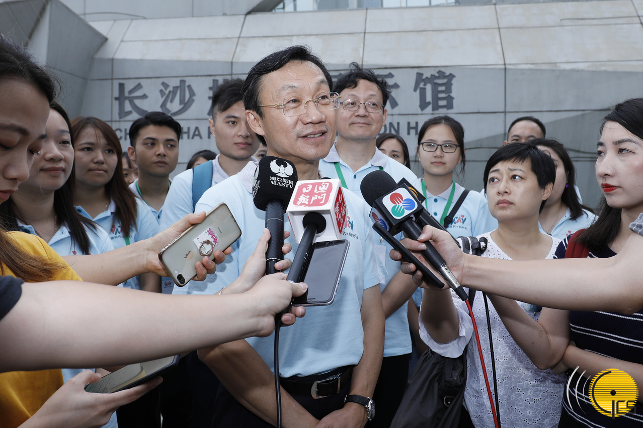 • Secretário para os Assuntos Sociais e Cultura, Alexis Tam, faz balanço à comunicação social, na qualidade de chefe da delegação de visita e aprendizagem «Caminhar juntos na Nova Era» à província de Hunan, no museu pavilhão do planeamento urbanístico da cidade de Changsha.