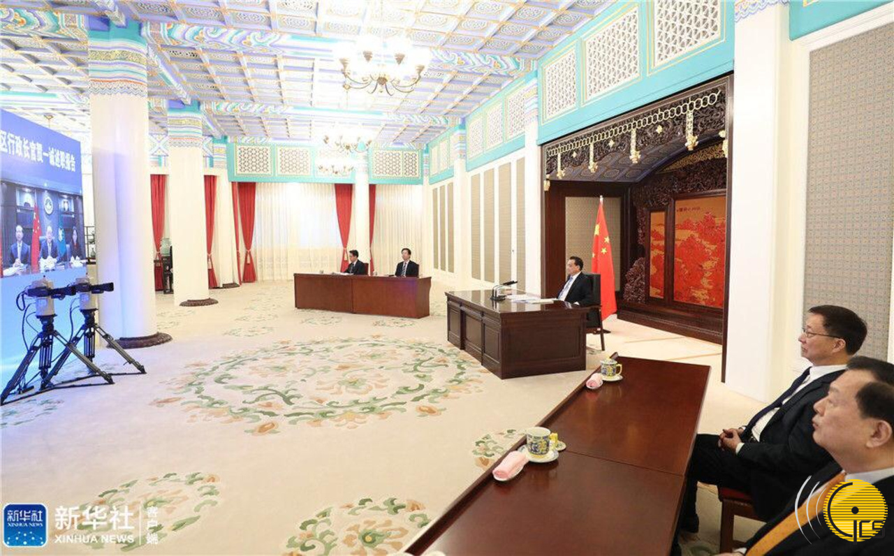 Chefe do Executivo, Ho Iat Seng, participa numa reunião por videoconferência com o Primeiro-ministro, Li Keqiang, para a qual foi convocado a apresentar o relatório de trabalho da RAEM (Fotografia da Xinhua).