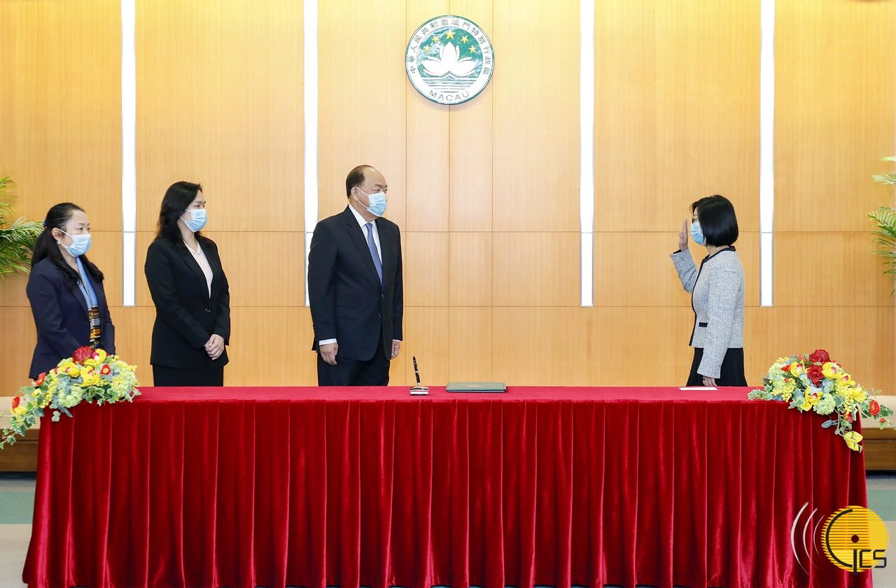 • Chefe do Executivo, Ho Iat Seng, preside à cerimónia de juramento da directora dos Serviços para os Assuntos da Sede do Governo, Lao Kuan Lai da Luz, testemunhada pela chefe do Gabinete do Chefe do Executivo, Hoi Lai Fong, testemunha a cerimónia.