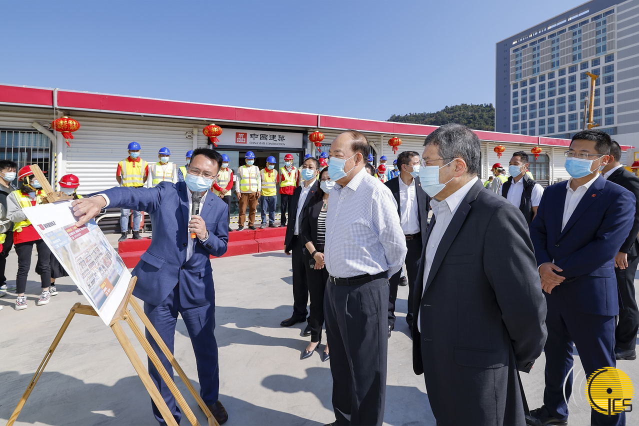 Chefe do Executivo, Ho Iat Seng, visita estaleiros de construção de instalações de serviços sociais e trabalhadores que permaneceram em Macau, durante as festividades do ano novo lunar, e ouviu a apresentação sobre o andamento das obras.