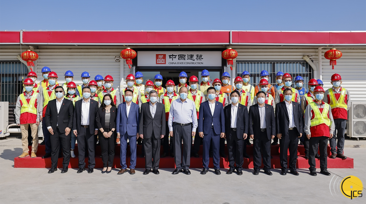 • Foto de grupo: Chefe do Executivo, Ho Iat Seng, com os representantes da empresa responsável pela construção dos apartamentos para idosos, durante a visita ao estaleiro.