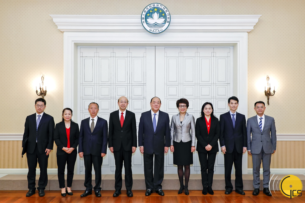 • Foto de grupo do Chefe do Executivo, Ho Iat Seng, com o novo comissário do Ministério dos Negócios Estrangeiros da República Popular da China na Região Administrativa Especial de Macau, Liu Xianfa, e respectiva comitiva.