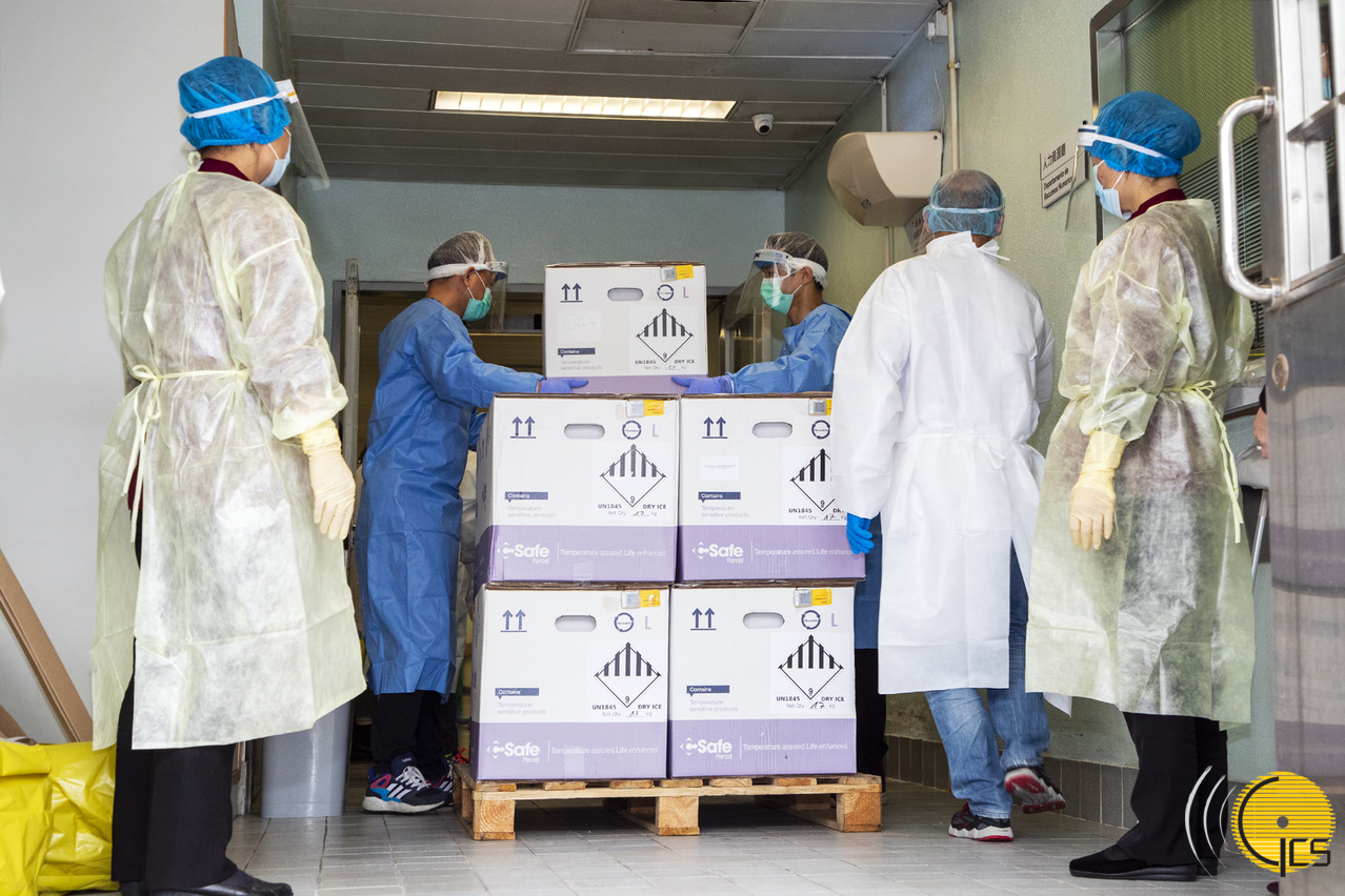 • Pessoal desinfecta embalagens das vacinas e transporta-as para o armazém de temperaturas ultrabaixas do Hospital.