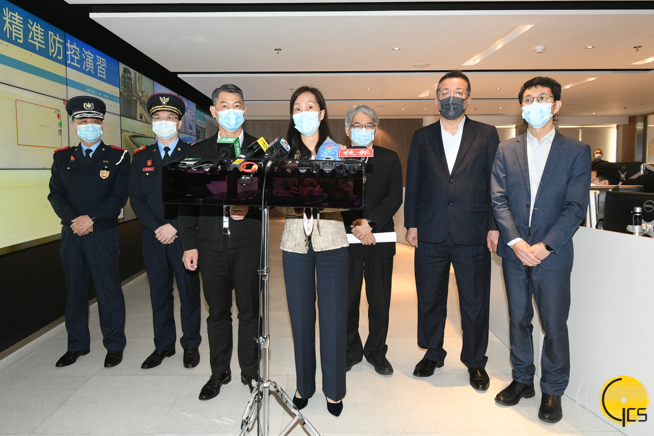 • Vice-presidente do Centro de Coordenação de Contingência do Novo Tipo de Coronavírus, e secretária para Assuntos Sociais e Cultura, Ao Ieong U, e o Comandante-geral dos Serviços de Polícia Unitários e comandante adjunto da acção conjunta, Leong Man Cheong, fazem o balanço do simulacro aos profissionais da comunicação social.