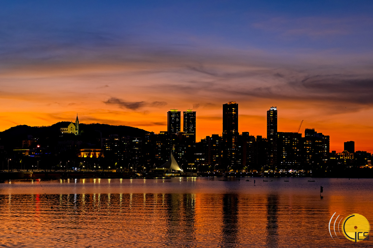 • As luzes do outro lado da costa vão iluminando, gradualmente, a cidade embeleza a escuridão e dá brilho ao horizonte.