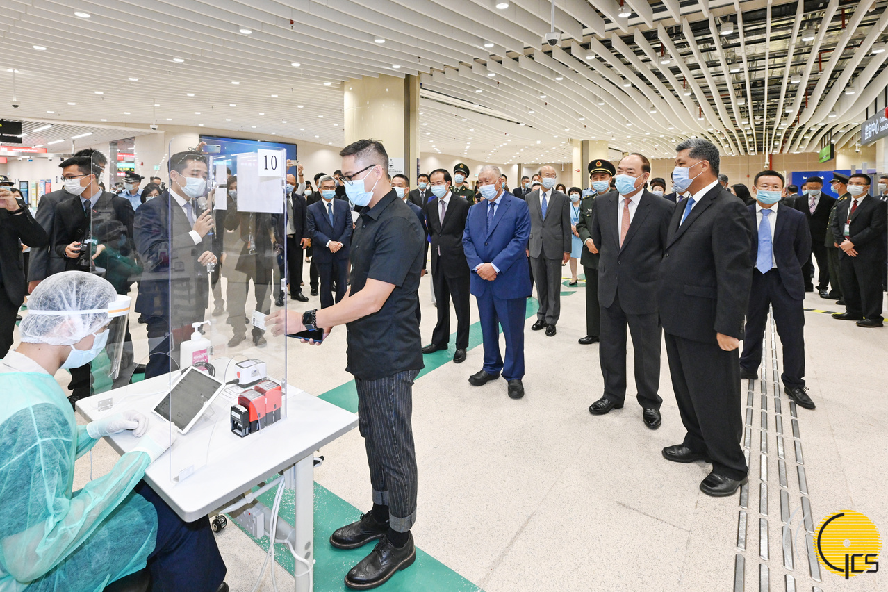 • Chefe do Executivo, Ho Iat Seng, governador da província de Guangdong, Ma Xingrui, e convidados de honra inspeccionam os equipamentos de controlo sanitário da Zona do Posto Fronteiriço da Parte de Macau do Novo Acesso Fronteiriço Guangdong-Macau (Posto Fronteiriço Qingmao).