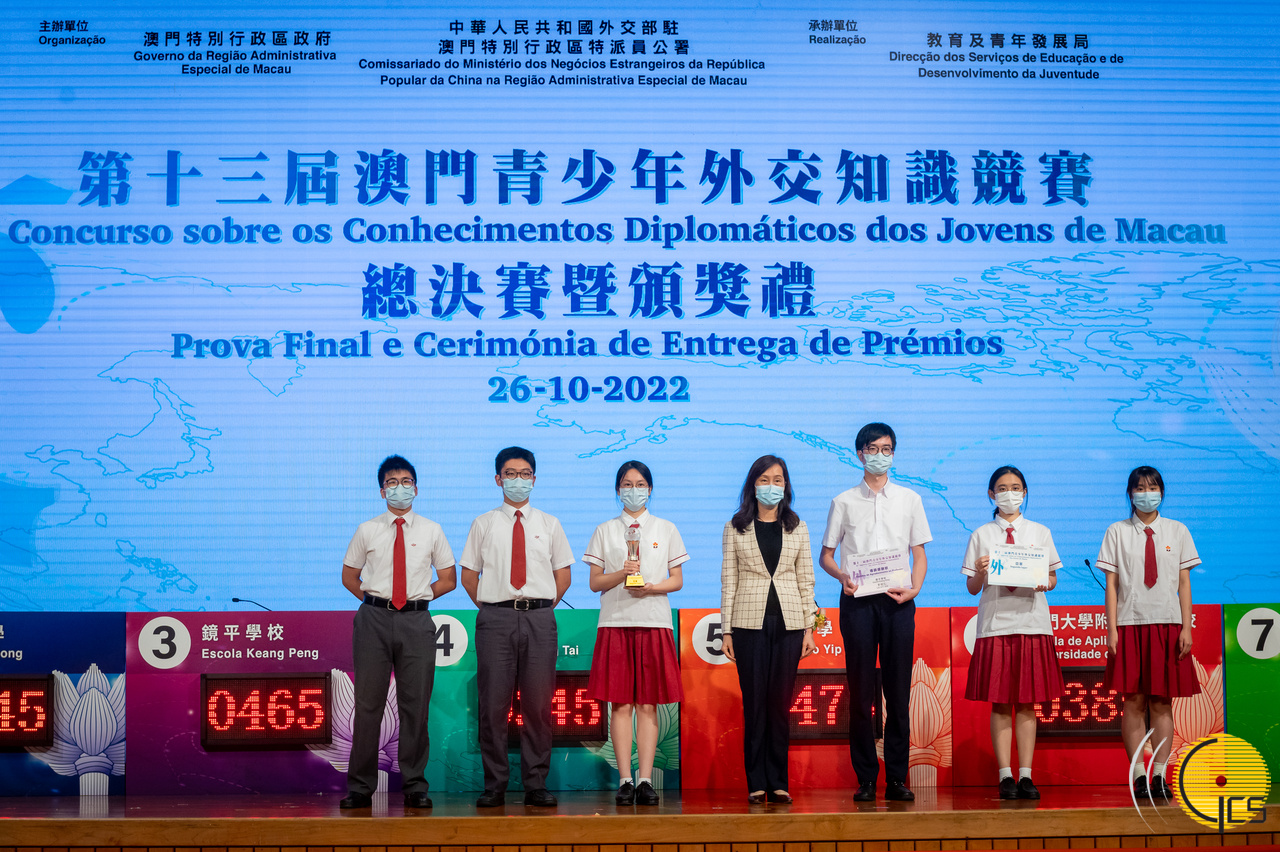 Secretária para os Assuntos Sociais e Cultura, Elsie Ao Ieong, presente na cerimónia de entrega de prémios do "13.º Concurso sobre os Conhecimentos Diplomáticos dos Jovens de Macau".