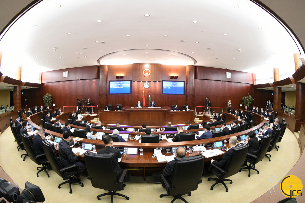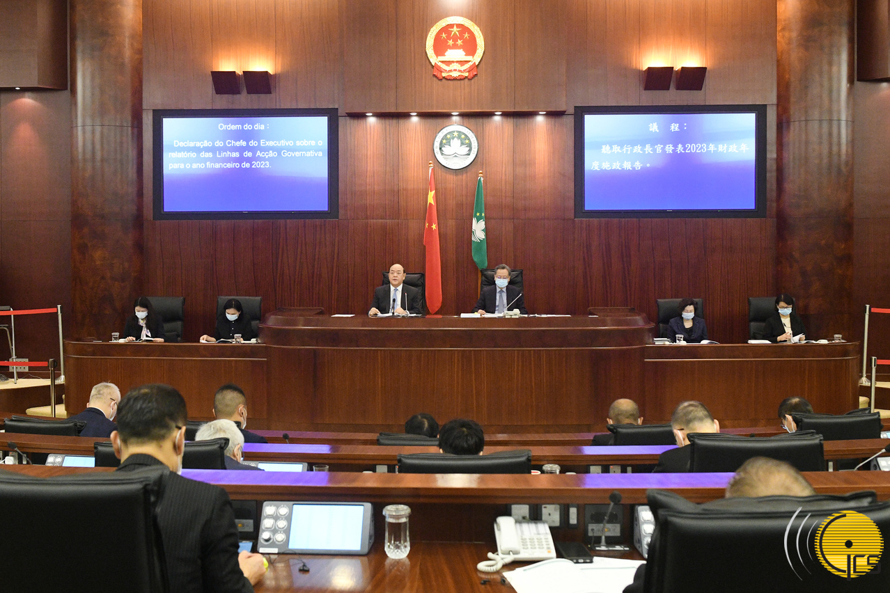 Chefe do Executivo, Ho Iat Seng, apresenta o Relatório das Linhas de Acção Governativa para o Ano Financeiro de 2023, na Assembleia Legislativa.