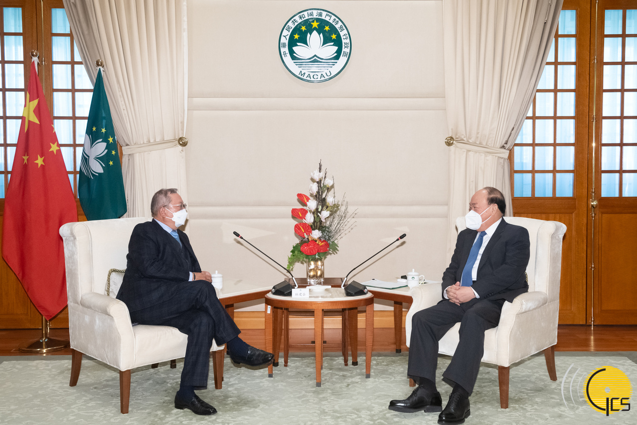 Chefe do Executivo, Ho Iat Seng reúne-se com o membro do Comité Nacional da Conferência Consultiva Política do Povo Chinês, e presidente do Conselho de Desenvolvimento do Comércio de Hong Kong e de Hong Kong's Lai Sun Group, Peter Lam.