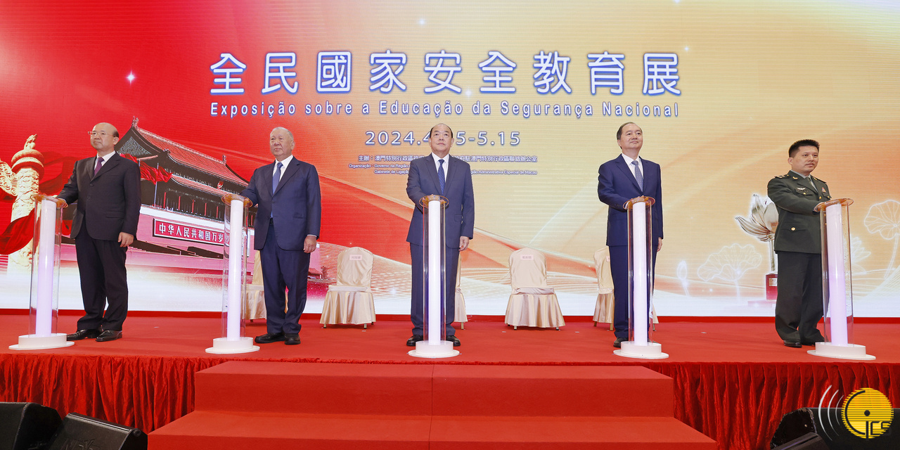 Presidente da Comissão de Defesa da Segurança do Estado da Região Administrativa Especial de Macau e Chefe do Executivo, Ho Iat Seng, e convidados presidem à cerimónia de inauguração da «Exposição sobre a Educação da Segurança Nacional» de 2024.