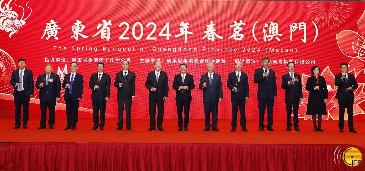 • Chefe do Executivo, Ho Iat Seng, e os convidados principais na recepção da Primavera da Província de Guangdong 2024, em Macau.