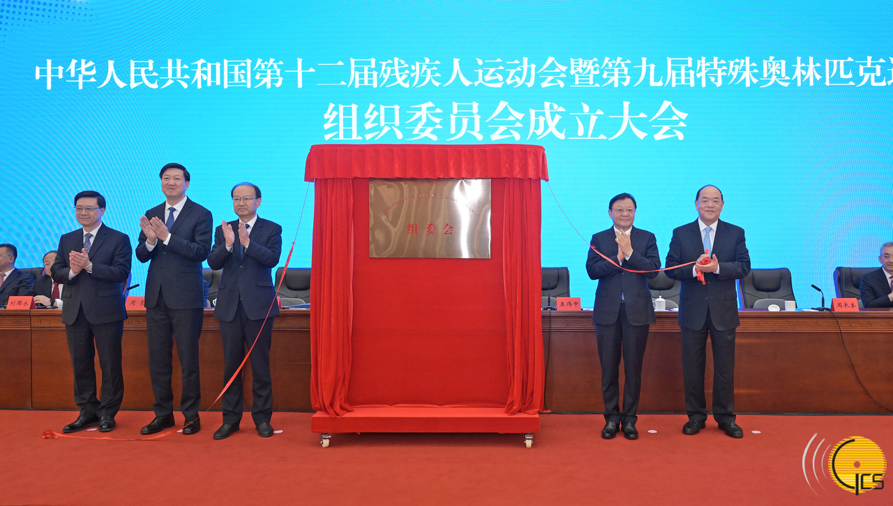 O Chefe do Executivo, Ho Iat Seng, o presidente da direcção da Federação de Pessoas Portadoras de Deficiência da China, Zhou Changkui, o director da Adminstração Geral de Desporto da China, Gao Zhidan, o governador da província de Guangdong, Wang Weizhong, e o Chefe do Executivo da Região Administrativa Especial de Hong Kong, John Lee Ka-chiu, presidem à cerimónia de descerramento da placa da comissão organizadora dos 12os Jogos Nacionais para Deficientes e dos 9os Jogos Olímpicos Especiais da China.