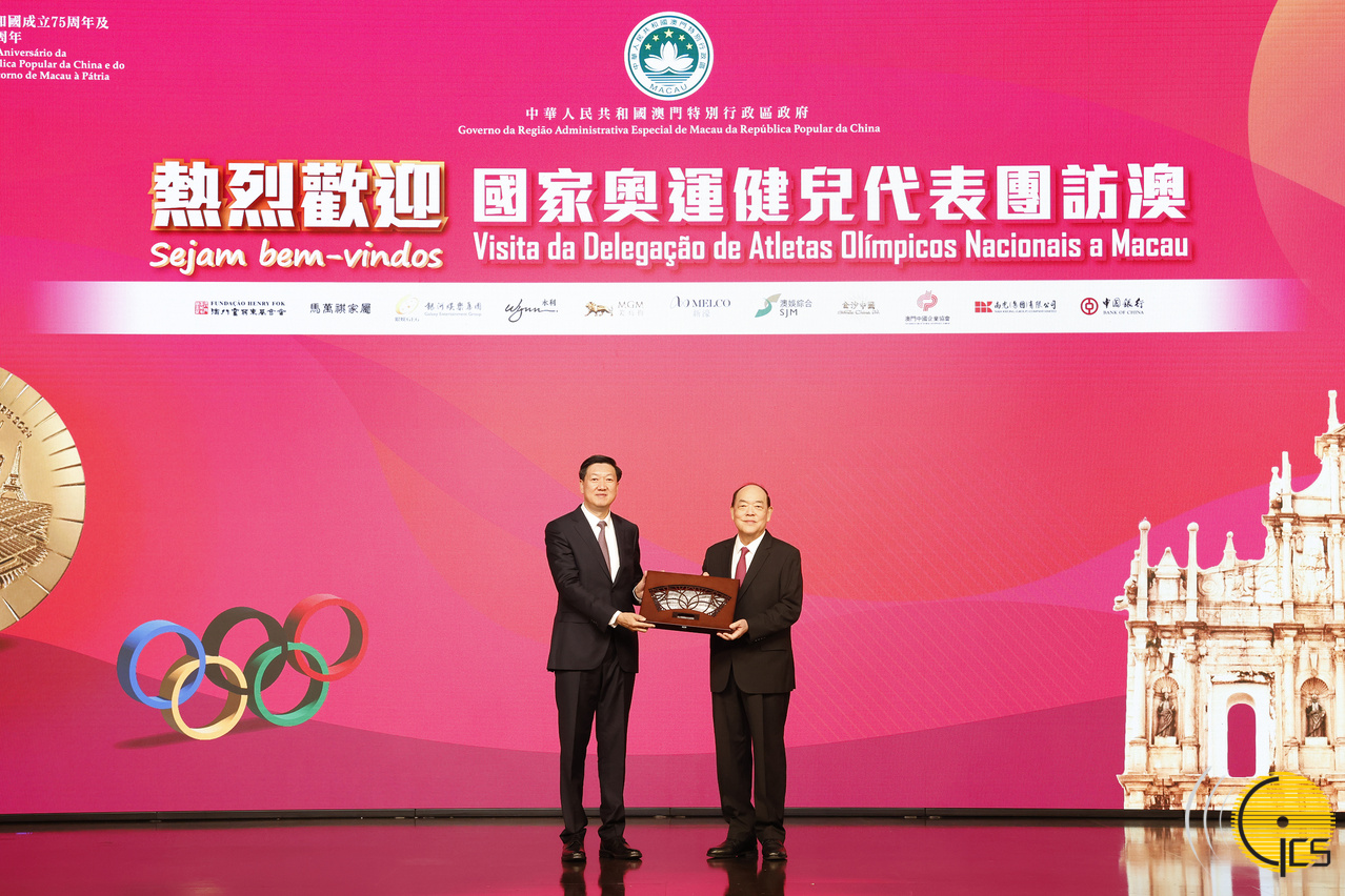 • Chefe do Executivo, Ho Iat Seng, oferece lembranças à Delegação de Atletas Olímpicos Nacionais, recebidos pelo chefe da Delegação de Atletas Olímpicos Nacionais e director da Adminstração Geral do Desporto, Gao Zhidan.