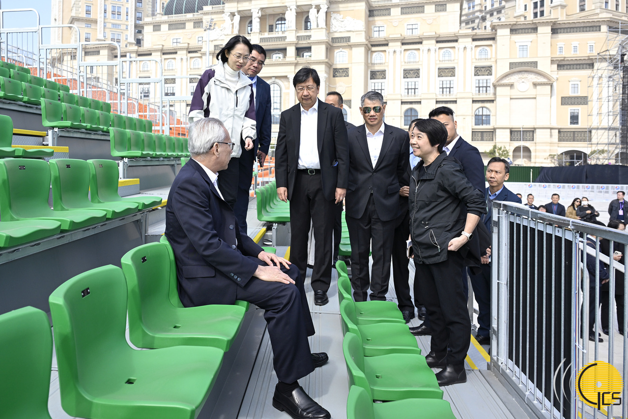 • Chefe do Executivo, Sam Hou Fai, assiste à apresentação sobre a configuração no local, as placas de sinalização e a montagem do palco.