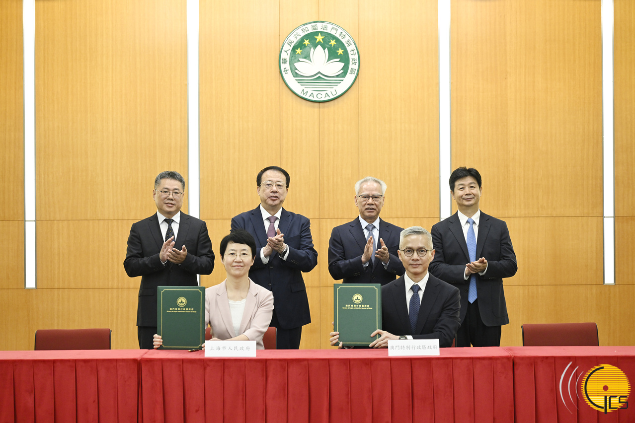 • Chefe do Executivo, Sam Hou Fai, o presidente do município de Xangai, Gong Zheng, o vice-director do Gabinete para os Assuntos de Hong Kong e Macau do Conselho de Estado, Lu Yuyin, e demais convidados testemunham a assinatura do «Memorando de Entendimento no âmbito de uma Nova Ronda de Cooperação entre Shanghai e Macau», com o secretário para a Economia e Finanças, Tai Kin Ip, e a vice-presidente do município de Xangai, Xie Dong, assinarem em representação dos respectivos governos.