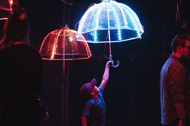 Também a ideia da união ganha aqui força neste projecto: “Nesta instalação tinha 10 guarda-chuvas e se, por exemplo, três pessoas tocassem em três guarda-chuvas, todos eles eram accionados, ou seja, todos eles passavam do vermelho para o azul”.