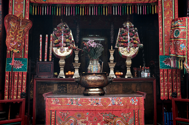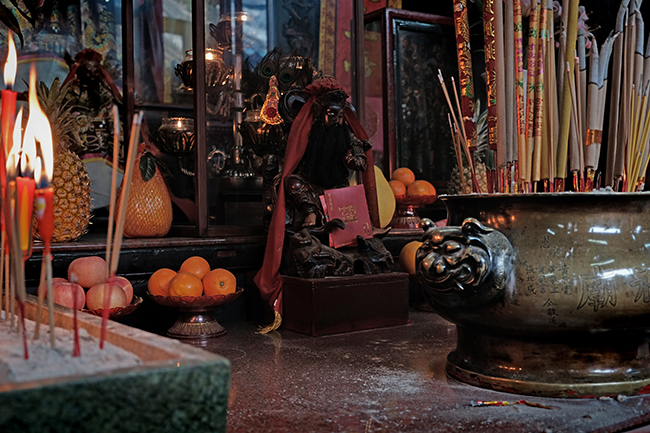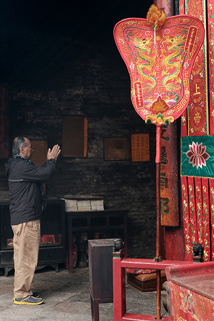 Kuan Tai é o Deus da Guerra e da Riqueza [consultar a edição 63]. Choi Pak é o Deus da Fortuna a quem se pede ganhos monetários para o dia-a-dia. Para ganhos no jogo há outras divindades a quem se pode acorrer, já que esta, por ser uma divindade celestial, lhe está negada a entrada na área da fortuna e azar. Já Luban é o patrono de todas as profissões relacionadas com a construção de um edifício – ou não fosse ele o presidente das Obras Públicas do Céu. Para além de ser patrono ainda de manufactores de chapéus-de-chuva (já que a ele se atribui a sua invenção, embora outros sejam da opinião que tal descoberta se deve à sua esposa), também é o patrono dos construtores de embarcações. Hua Tuo, deus da medicina do terceiro nível ou departamento, é um dos Dez Doutores Celebrados. Terá sido o primeiro médico a perceber o conceito da cirurgia e a sua importância, por isso ele é o patrono dos cirurgiões e dos massagistas e, também, o espírito que faz com os médios curem as doenças. No nicho lateral do lado direito da entrada, Hua Tuo encontra-se acompanhado pelos seus dois assistentes – um com o livro das prescrições, e o outro com um boião contendo produtos medicinais.
