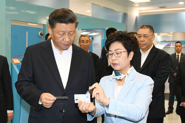Presidente Xi Jinping ouve a apresentação da secretária para a Administração e Justiça, Sónia Chan, sobre as características de segurança do Bilhete de Identidade de Residente de Macau contra a falsificação