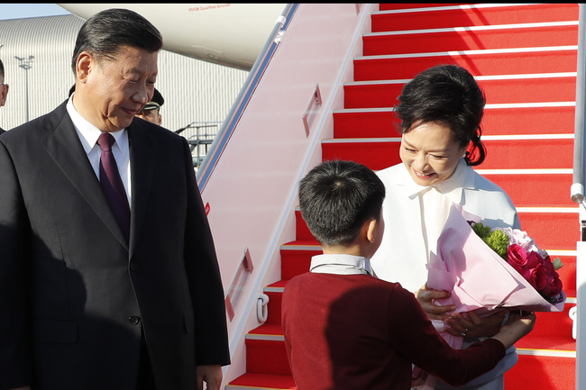 1_Presidente Xi Jinping e a esposa, Peng Liyuan, à chegada ao Aeroporto Internacional de Macau, num voo especial.