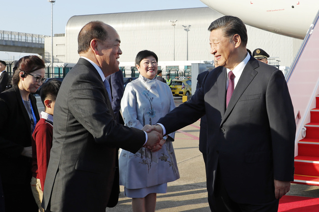 1_Presidente Xi Jinping cumprimenta o Chefe do Executivo, Chui Sai On, que se encontrava no local para o receber.