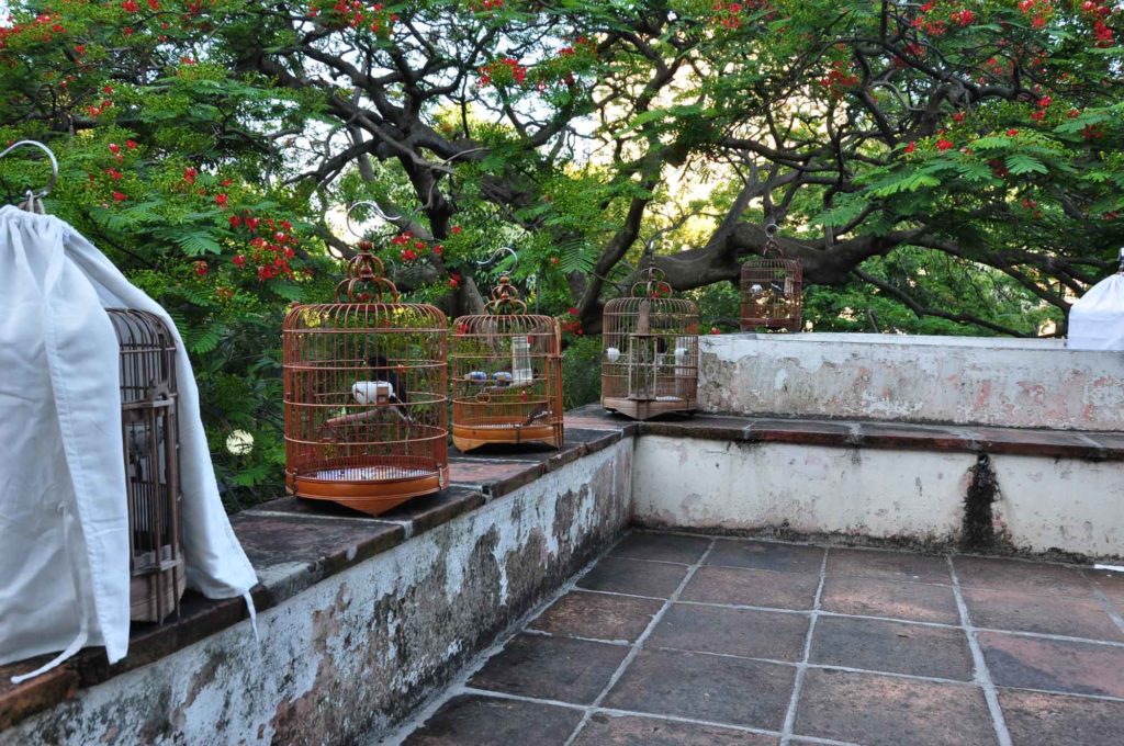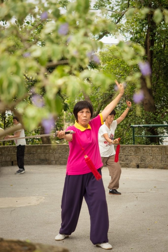 São oito da manhã e de ambos os lados da alameda que rasga ao meio a entrada do Jardim, há grupos concentrados na ligeireza dos movimentos lentos do tai chi. Na falange mais pequena, constituída sobretudo por mulheres de meia idade, há leques que se seguram com a candura de quem procura manter intacto um dente-de-leão no olho de uma tempestade: a trupe sincroniza os gestos, esvoaça com a delicadeza de uma borboleta e o tempo parece prolongar-se enquanto o ténue ritual se alonga. Ali ao lado, um idoso esguio tenta pendurar uma gaiola de madeira num dos ramos mais baixos de uma figueira-de-goa.