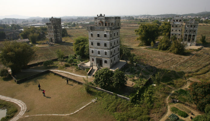 Os “diaolou”, impressionantes conjuntos habitacionais e comunitários mandados construir por chineses ultramarinos, emergem como sentinelas nas vastas planícies de Kaiping