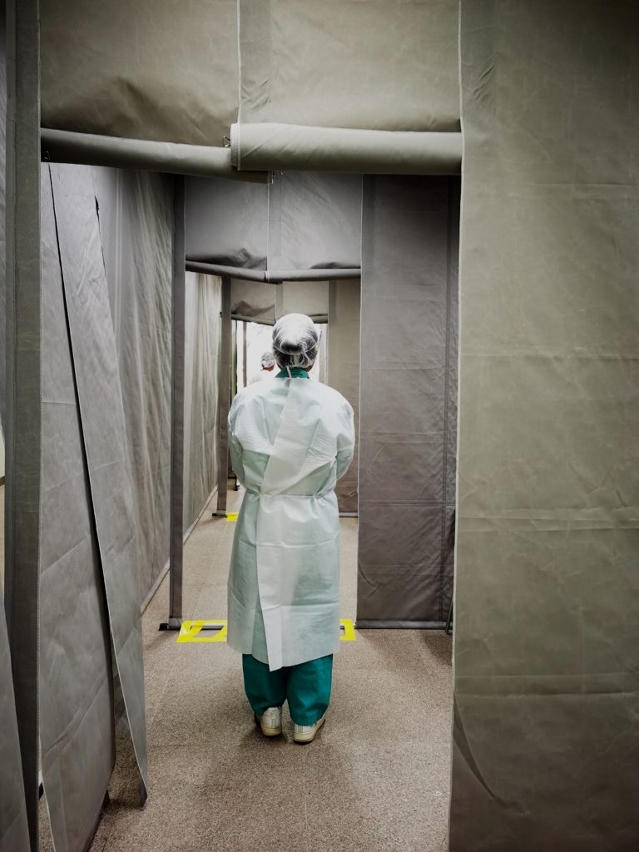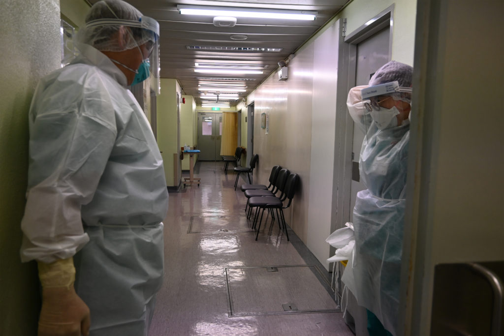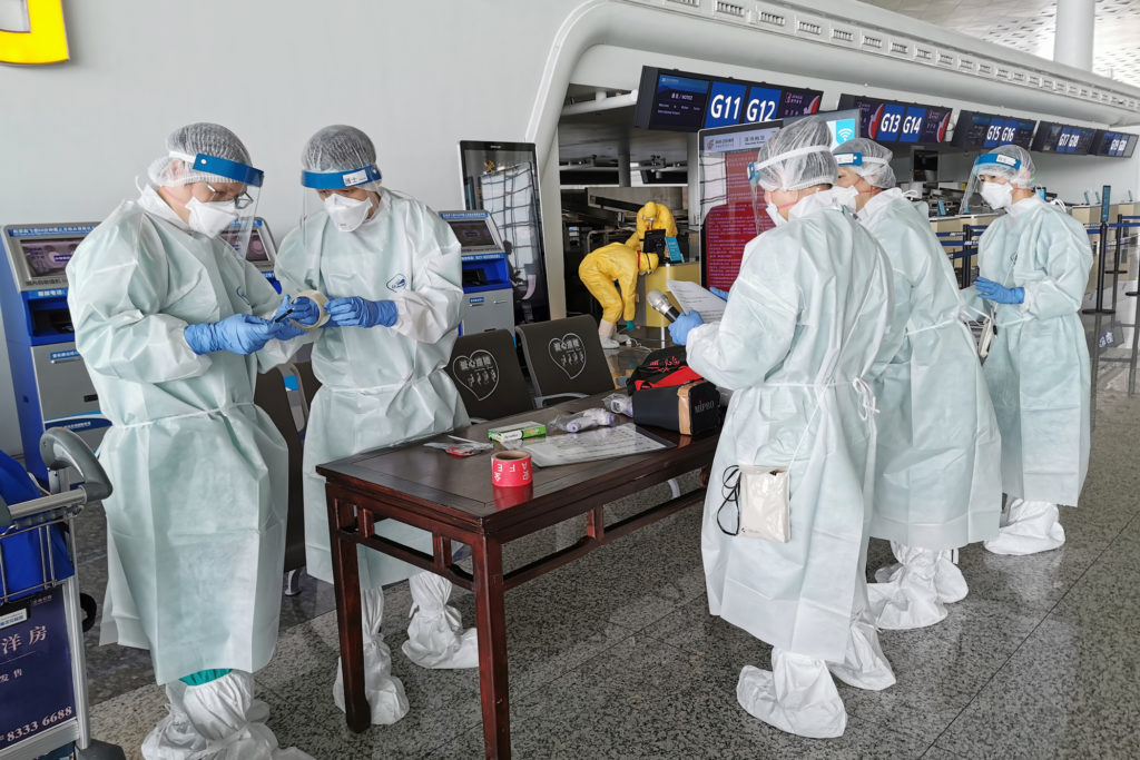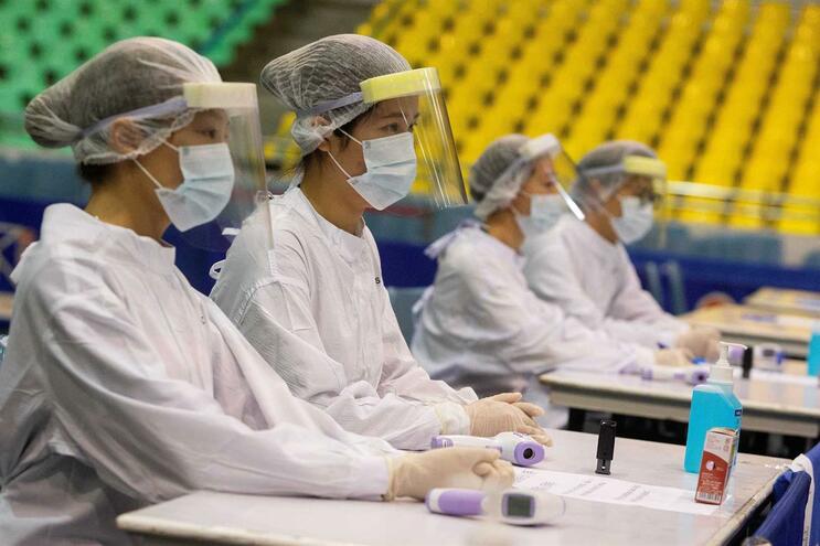 Profissionais de saúde equipados de forma rigorosa para lidarem com os casos suspeitos