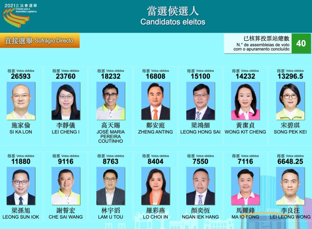 Mais de 137 mil eleitores que estavam recenseados compareceram às urnas, representando 42,38 por cento do universo de votantes para o sufrágio directo. Das 14 listas candidatas, metade conseguiu eleger deputados, com a lista 3 da Associação dos Cidadãos Unidos de Macau a sair como vencedora deste acto eleitoral.