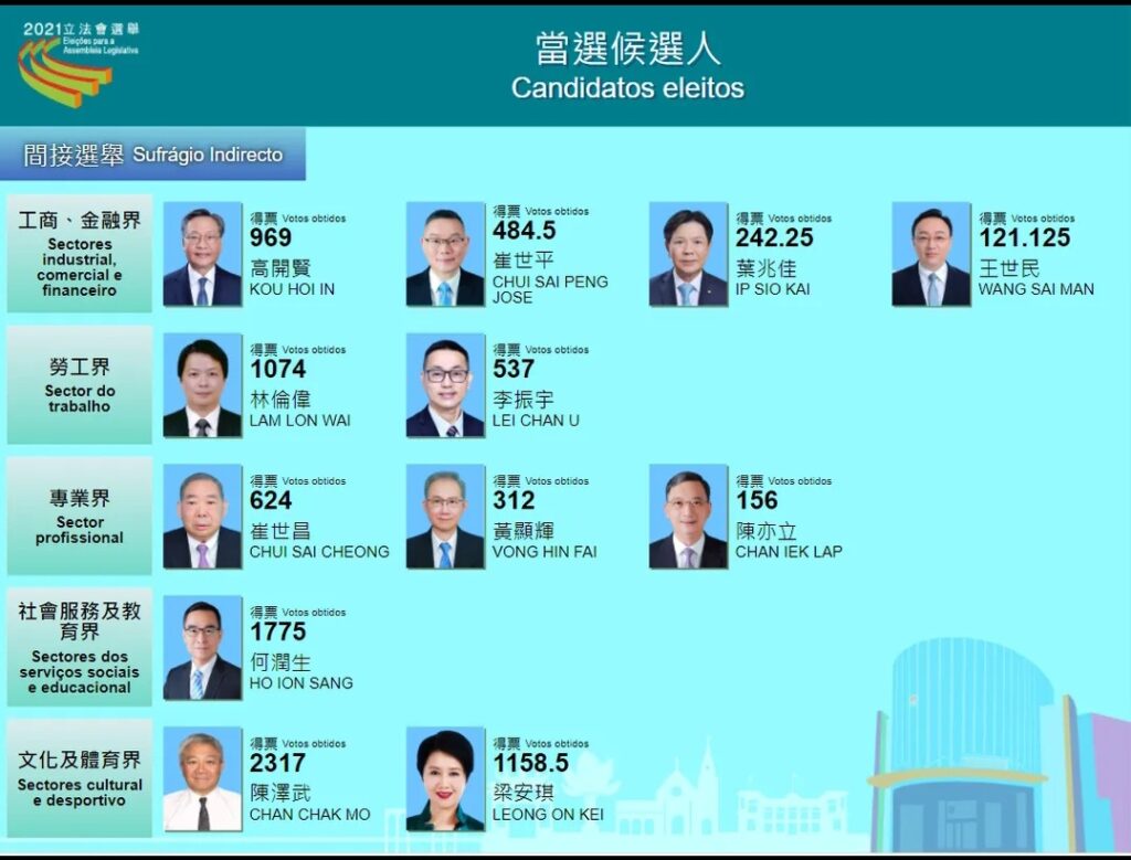 Os 12 deputados eleitos pelo sufrágio indirecto já têm experiência no hemiciclo. Kou Hoi In, José Chui Sai Peng, Ip Sio Kai e Wang Sai Man (sectores industrial, comercial e financeiro), Lam Lon Wai e Lei Chan U (sector do trabalho), Chui Sai Cheong, Vong Hin Fai e Chan Iek Lap (sector profissional), Ho Ion Sang (sector dos serviços sociais e educacional), e Chan Chak Mo e Angela Leong On Kei (sectores cultural e desportivo).