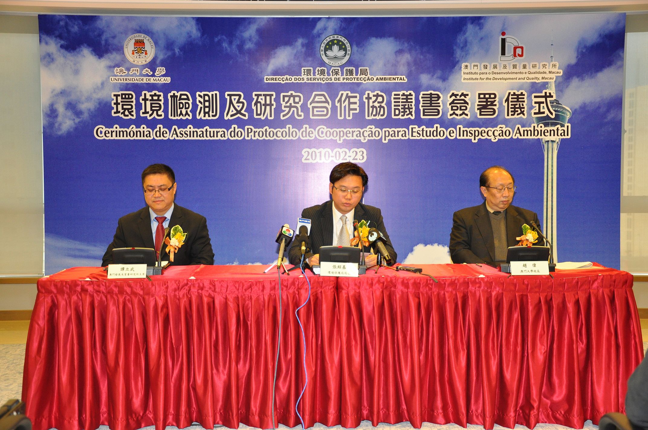 A Cerimónia de Assinatura do Protocolo de Cooperação para Estudo e Inspecção Ambiental foi realizada em 23 de Fevereiro de 2010, na sala multi-funcional da DSPA. Foram convidados trinta representantes provenientes dos serviços públicos e instituições para testemunhar a cerimónia, presidida pelo Director dos Serviços de Protecção Ambiental, Cheong Sio Kei, pelo Reitor da Universidade de Macau, Zhao Wei, e pelo Tam Lap Mou, Presidente do Instituto para o Desenvolvimento e Qualidade de Macau.
