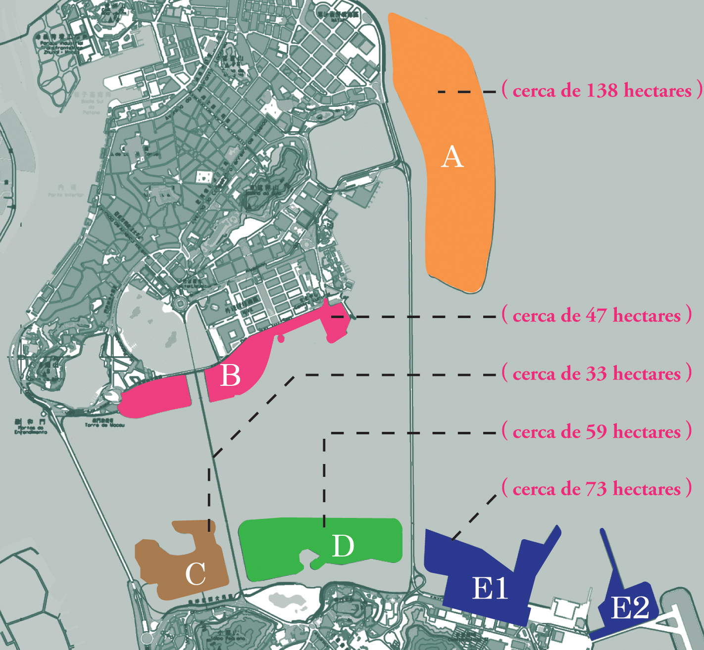 Os novos aterros localizar-se-ão a Leste e Sul da Península de Macau e a Norte da Taipa, com uma área total de 350 hectares, e vão constituir, previsivelmente, a maior reserva de terras para os próximos 20 a 30 anos. O Conselho de Estado referiu no documento de autorização que a construção das novas zonas urbanas de Macau faz desempenhar as vantagens de “um país, dois sistemas”, atenuando a grave escassez de recursos de solos da RAEM e constitui uma acção importante para a melhoria da qualidade de vida da população, o que é favorável para Macau fazer face à crise financeira e manter o desenvolvimento económico estável e relativamente rápido, promovendo a harmonia e estabilidade da sociedade. Assim, o Governo da RAEM deve concretizar o “planeamento científico, distribuição razoável e uso intensivo” bem como o “esforço conjunto de cooperação, organização, reforço da gestão e avanço disciplinado”. Para satisfazer as exigências previstas no documento do Governo Central que dá autorização para o aterro e em articulação com o posicionamento da RAEM como “centro internacional de turismo e lazer”. O Governo da RAEM constituiu o referido grupo de trabalho que integra a Direcção dos Serviços de Solos, Obras Públicas e Transportes, Direcção dos Serviços para os Assuntos de Tráfego, Direcção dos Serviços de Protecção Ambiental, Capitania dos Portos e Gabinete para o Desenvolvimento de Infra-estruturas, para levar adiante de forma ordenada o estudo e elaboração do planeamento dos novos aterros,