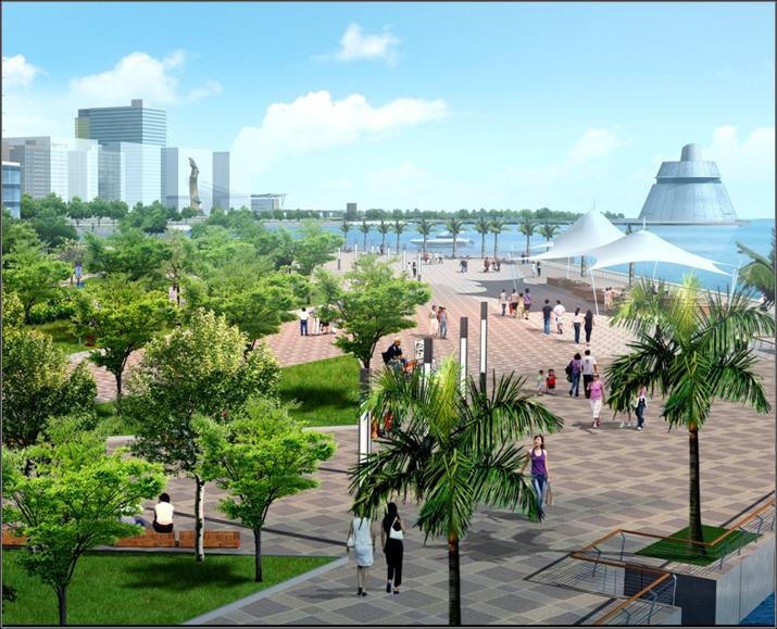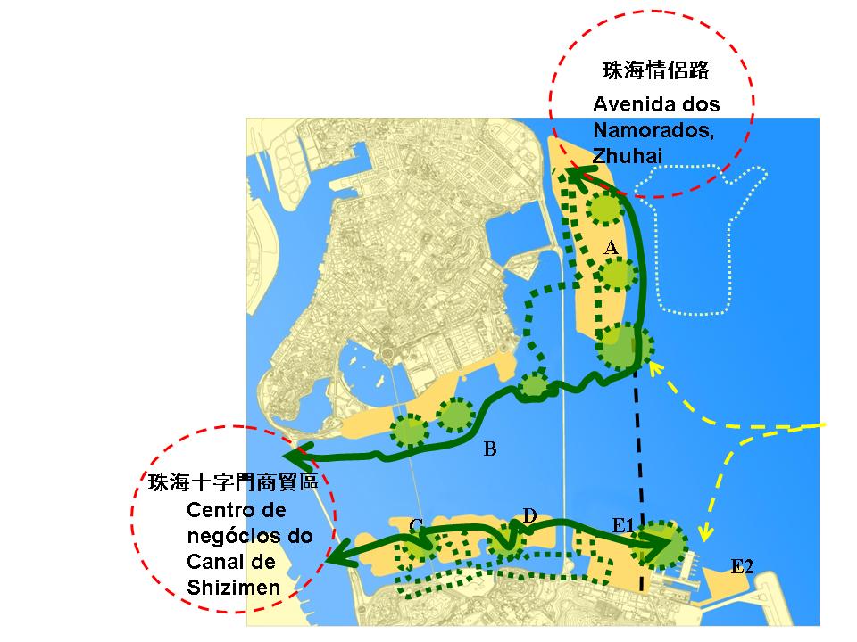 Por outro lado, o planeamento vai estudar a hipótese de se articular com a “Avenida dos Namorados” de Zhuhai, um passeio marginal verde com cerca de 50km de extensão, no sentido de optimizar a paisagem urbana das orlas costeiras da Península de Macau e da Taipa, prolongando a faixa verde da Região, por forma a proporcionar à sua população um espaço de lazer. Macau vai usar as suas vantagens geográficas, mediante o planeamento das novas zonas urbanas, aproveitando a oportunidade da construção do centro de negócios do Canal de Shizimen, Zhuhai, para aumentar a integração regional e o desenvolvimento coordenado.