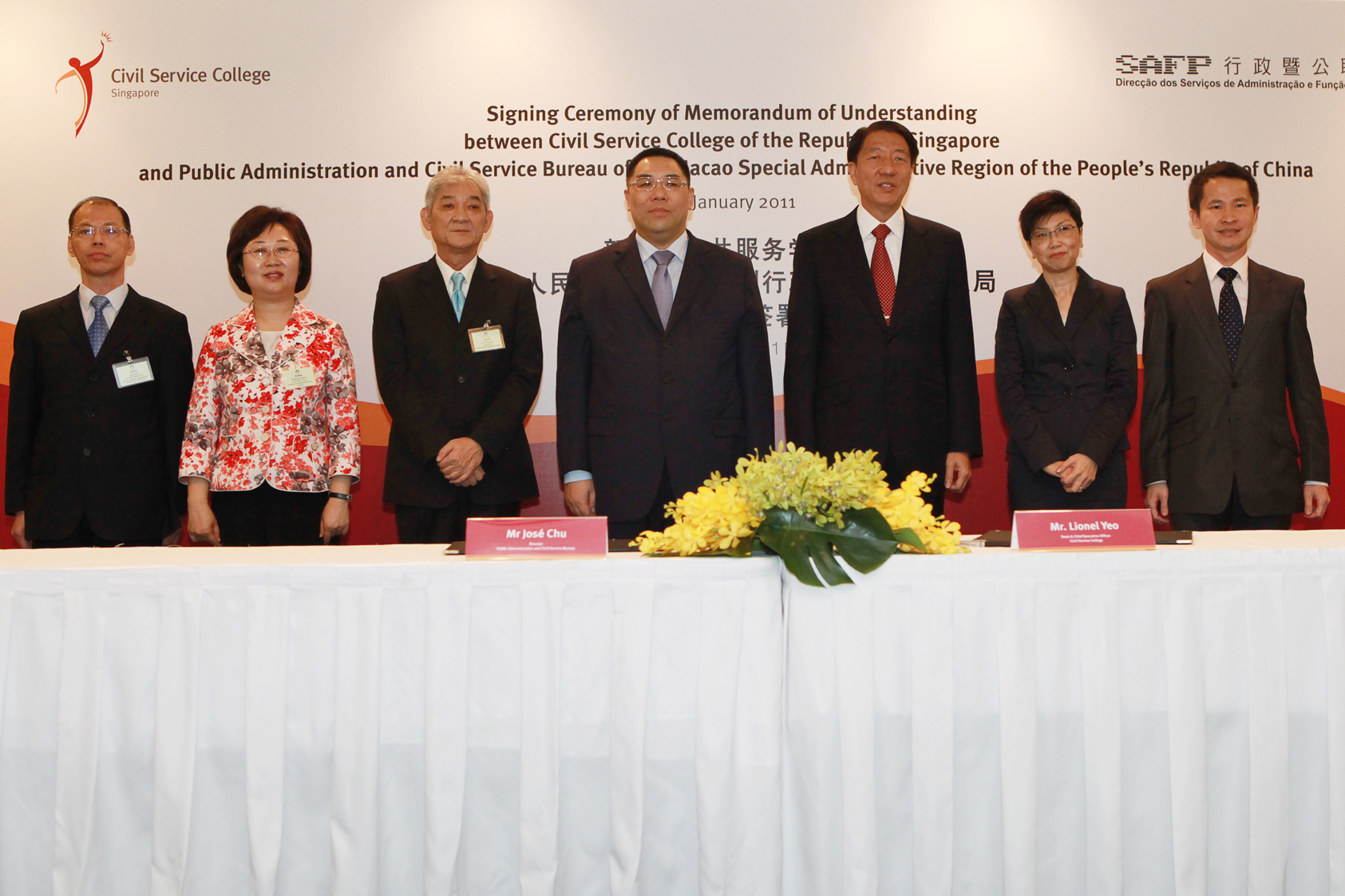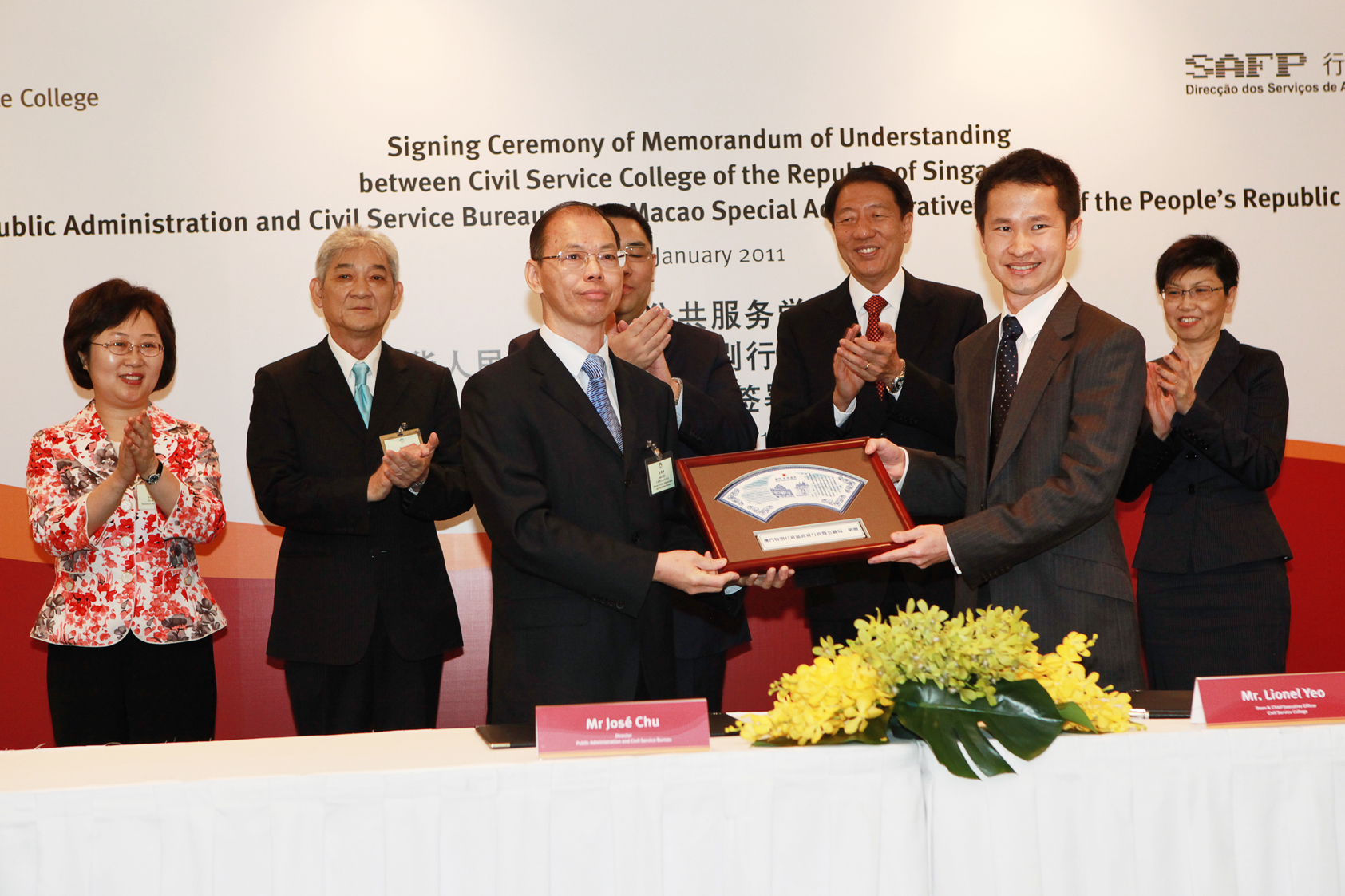 A cerimónia de assinatura, que teve lugar ao meio-dia do dia 11 de Janeiro, no Hotel Shangri-La Singapore, foi testemunhada por Sua Ex.ª, o Chefe do Executivo Dr. Chui Sai On, o Presidente da Assembleia Legislativa Lau Cheoc Va, a Secretária para a Administração e Justiça Dra. Florinda Chan, o Vice-Primeiro Ministro da Singapura Sr. Teo Chee Hean e a secretária permanente da Singapore Public Service Division Sra. Lim Soo Hoon, tendo o Director do SAFP Dr. José Chu e o Director do Civil Service College da Singapura Sr. Yeo Hung Tong em representação, respectivamente, da RAEM e da Singapura assinado o memorando de entendimento.