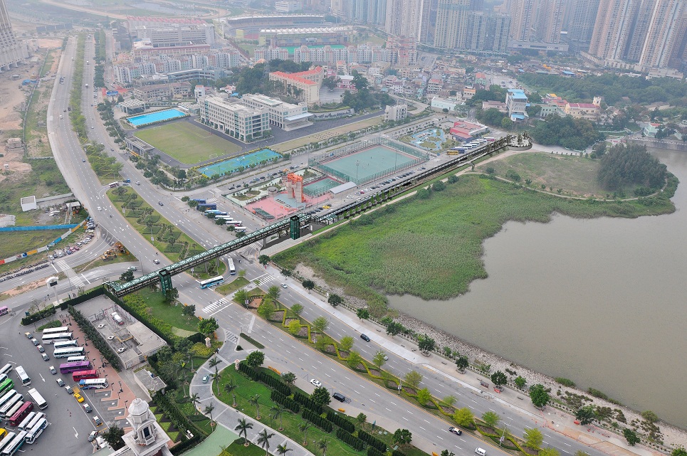O sistema de ligação pedonal ligando o bairro antigo da Taipa e o Cotai, fará um atravessamento sobre a Rua da Baía de Nossa Senhora de Esperança e a Estrada da Baía de Nossa Senhora da Esperança. O projecto contempla elevadores, passadeira automática horizontal, escadas rolantes e escadas, com cerca de 350 metros de comprimento. Com o objectivo de apoiar no melhoramento de condições do bairro antigo da Taipa através deste projecto, este equipamento é utilizado para interligar os percursos de circulação pedonal da zona envolvente do Cotai e do bairro antigo da Taipa, por forma a dinamizar a ligação interactiva das duas zonas. O sistema pedonal adopta uma linguagem leve e transparente, criando um efeito de coordenação com a paisagem periférica. A fim de criar um equipamento com possibilidade de integração tanto ao nível da paisagem urbanística, como ao nível de tráfego, este equipamento é projectado com o objectivo principal de facilitar a circulação dos peões, ao mesmo tempo, prevê também a ligação com a actual paragem de autocarros e à futura estação de metro ligeiro.