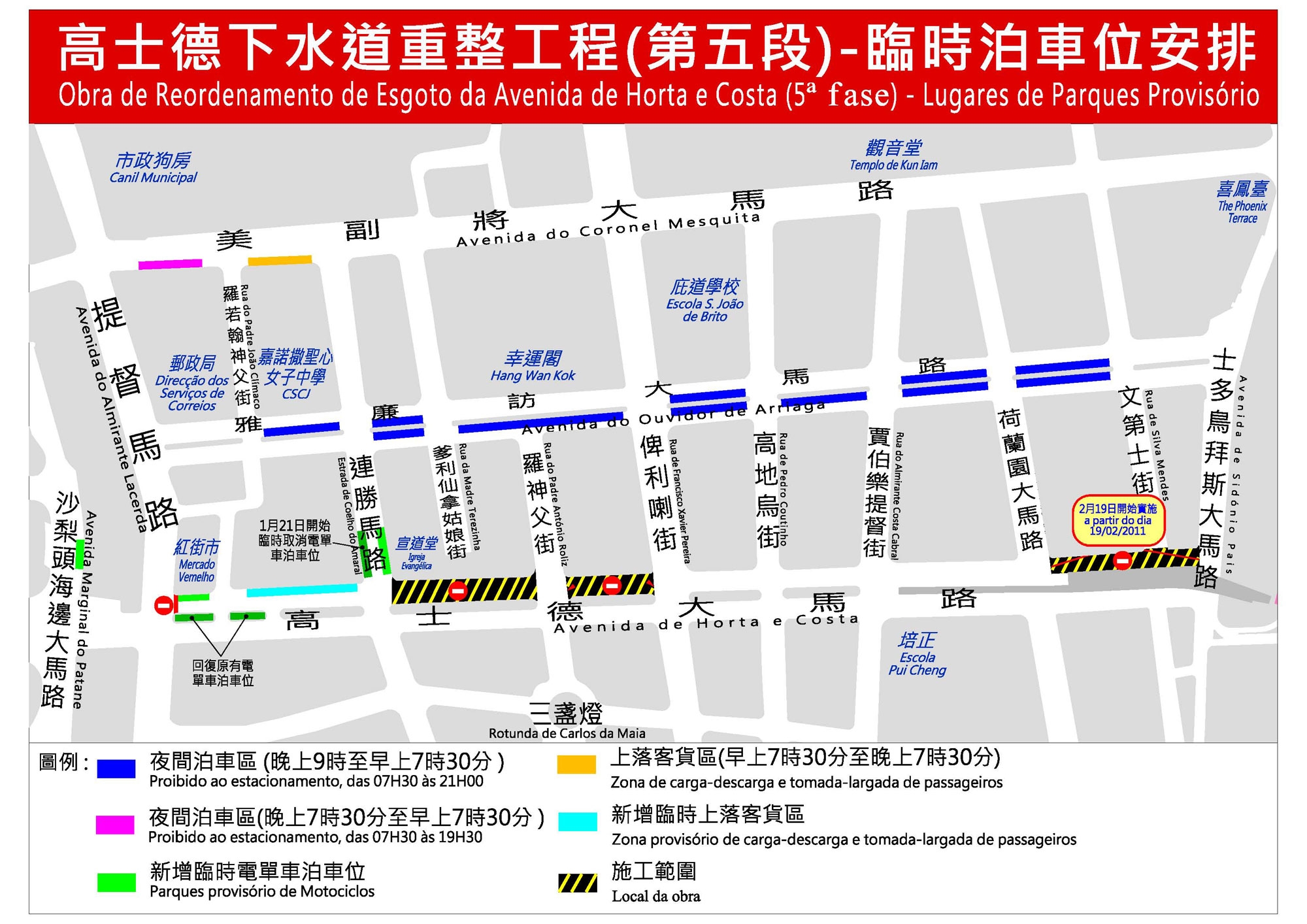Apesar de se encontrar actualmente em curso a execução dos trabalhos referentes ao 2.º troço da obra de reordenamento da rede de drenagem da Avenida de Horta e Costa, contudo para fazer face às aspirações em geral dos moradores e comerciantes e a fim de acelerar o andamento da obra, reduzindo-se assim o prazo global da obra, foi então decidido pela Administração em avançar, antes da conclusão dos trabalhos referentes ao 2.º troço, com a execução simultânea dos trabalhos referentes ao 5.º troço da Avenida de Horta e Costa, em direcção ao Túnel da Guia, compreendido entre a Avenida do Conselheiro Ferreira de Almeida e a Avenida de Sidónio Pais, que será vedado ao trânsito a partir das 10:00 horas do próximo sábado (dia 19 de Fevereiro), seguido do início da execução dos trabalhos em si, na expectativa de se concluir estes trabalhos em princípios de Abril. A par disso, chamamos a atenção dos passageiros de que durante este período, a carreira nocturna N2 não parará na paragem de autocarro localizada junto da Avenida de Horta e Costa/Rua do Almirante Costa Cabral.