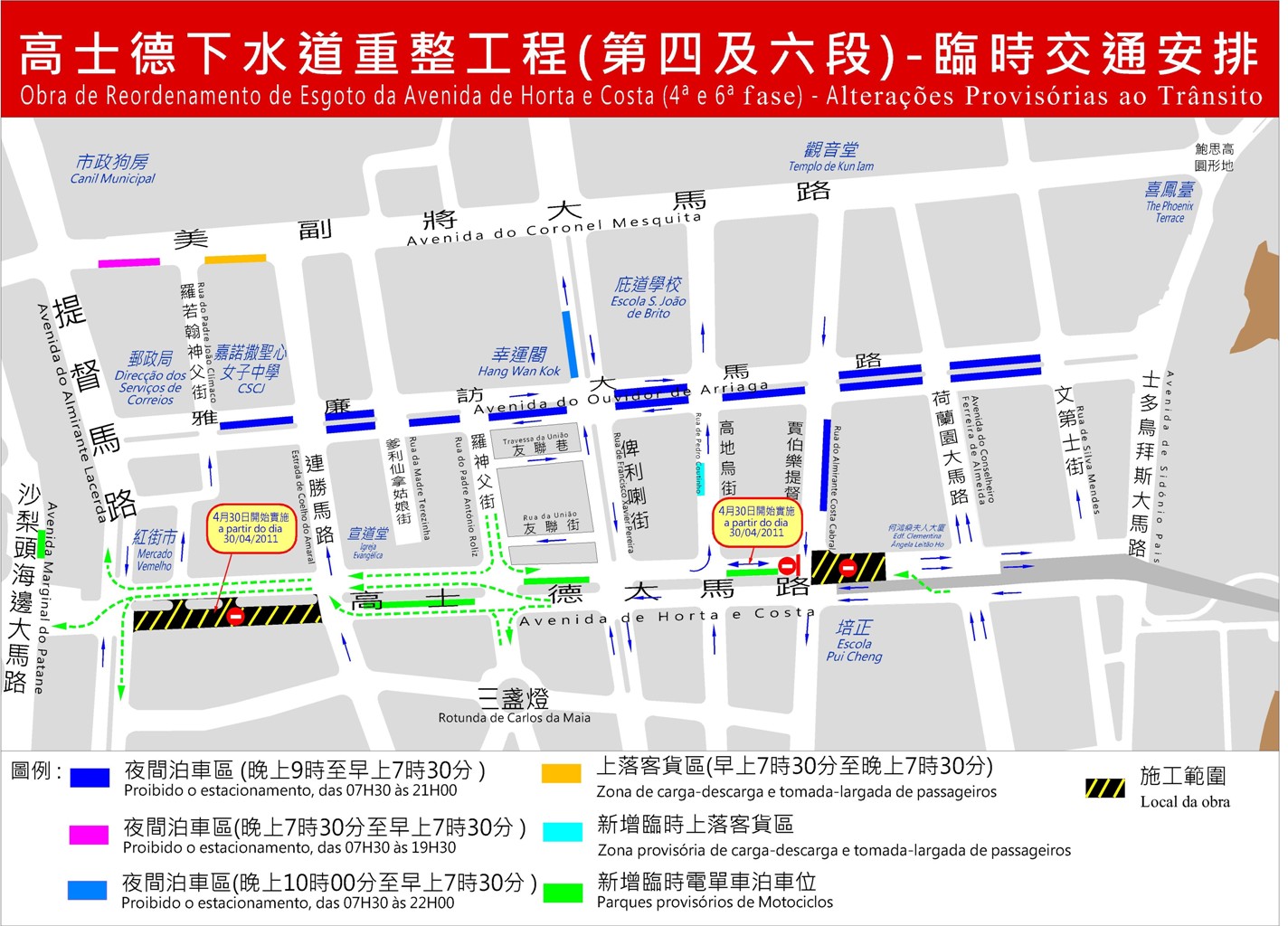 Em harmonia com a execução da obra, um troço da Avenida de Horta e Costa em direcção do Bairro do Fai Chi Kei, compreendido entre a Estrada de Coelho do Amaral e a Avenida do Almirante Lacerda, será interditado ao trânsito e proibido o estacionamento. E será invertido o sentido de circulação de um troço da Avenida de Horta e Costa, junto do Mercado Municipal Almirante Lacerda, compreendido entre a Rua do Padre António Roliz e a Avenida do Almirante Lacerda, bem como será desactivado a zona de estacionamento durante o período nocturno junto da Igreja Evangélica, os lugares de estacionamento para motociclos e a zona para tomada e largada de passageiros e carregamento e descarregamento de mercadorias junto do Mercado Municipal Almirante Lacerda. No entanto para responder às necessidades dos cidadãos em termos de estacionamento, no troço da Avenida de Horta e Costa, compreendido entre a Rua de Manuel de Arriaga e a Estrada de Coelho do Amaral, será criado uma zona provisória para o estacionamento de motociclos (separador central em frente do Edf. Grand Oceania). E ainda não obstante a este facto, um troço da Rua do Rebanho, Rua da Emenda e Rua do Lu Cao, compreendido entre a Rua de Tomé Pires e a Avenida de Horta e Costa, serão interditados ao trânsito e proibido o estacionamento. E o trânsito da Rua de Manuel de Arriaga somente poderá virar à esquerda em direcção da Avenida de Horta e Costa, e o trânsito da Rua de Tomé Pires não poderá seguir directamente em direcção da Rotunda de Carlos da Maia.