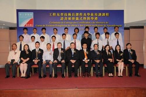 A Cerimónia de Entrega dos Certificados e da Abertura do Curso de Técnicos Estagiários de Obras e dos Cursos em Regime de Aprendizagem, organizada pela Direcção dos Serviços para os Assuntos Laborais (DSAL) teve lugar no dia 1 de Setembro na Sala Lótus do Centro de Comércio Mundial Macau, tendo sido atribuídos certificados aos 19 formandos aprovados no Curso de Técnicos Estagiários de Obras 2010 e aos 52 formandos aprovados na 13.ª Edição dos Cursos em Regime de Aprendizagem, e ainda foram premiados 8 formandos das 13.ª e 14.ª Edições do Curso em Regime de Aprendizagem que obtiveram melhores classificações ou que nunca faltaram às aulas. Nesta cerimónia, o Director da DSAL Dr. Shuen Ka Hung encorajou os formandos aprovados a contribuírem com empenho para a sociedade através das técnicas profissionais adquiridas e, os formandos que ainda se encontram a receber formação, devem aproveitar esta oportunidade de aprendizagem para enriquecer sua experiência profissional.