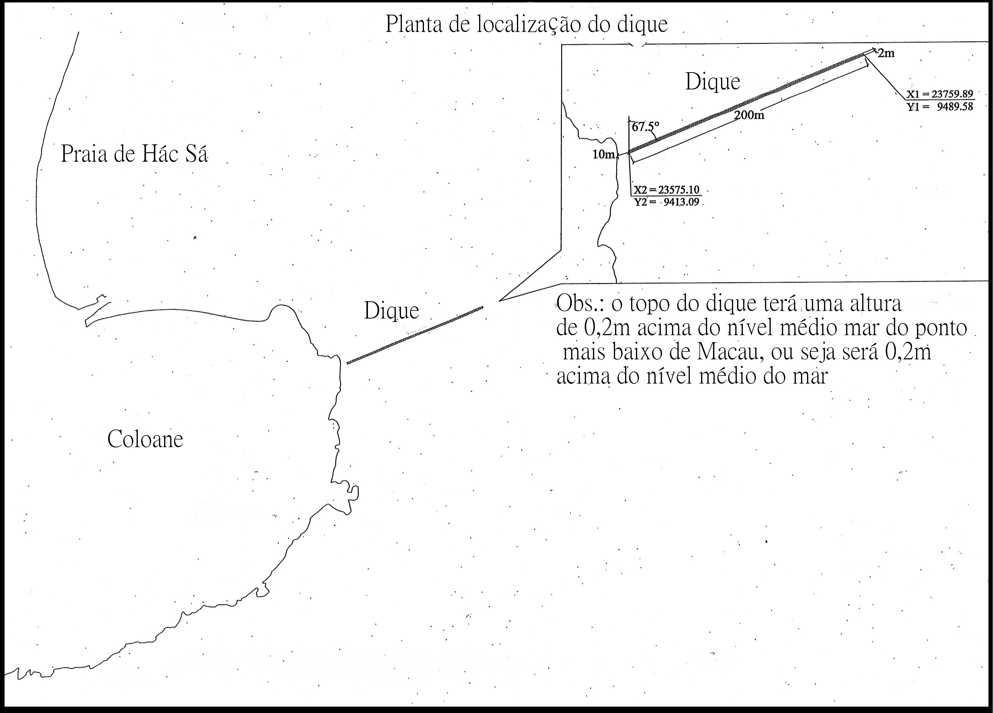 Este dique submarino consiste na execução de dique cujo topo se encontra ao nível da parte relativamente mais tranquila do mar, que além de minimizar o impacto das ondas, permitirá ainda proteger a areia da praia, por forma a evitar assim um maior desgaste. A “Empreitada de concepção e construção de dique submarino de Hac Sá Long Chao Kok” representa a execução do primeiro dique deste tipo e concretamente se encontrará localizado no passeio do Long Chao Kok, passando depois junto do acesso à Praia de Hác Sá, com 200m de comprimento, que depois trespassará pelo mar e se estenderá a norte do sudoeste para o nordeste. O aludido dique será compacto e terá 2m de largura, encontrando-se o topo do dique a uma altura de 0,2m acima do nível médio mar do ponto mais baixo de Macau.