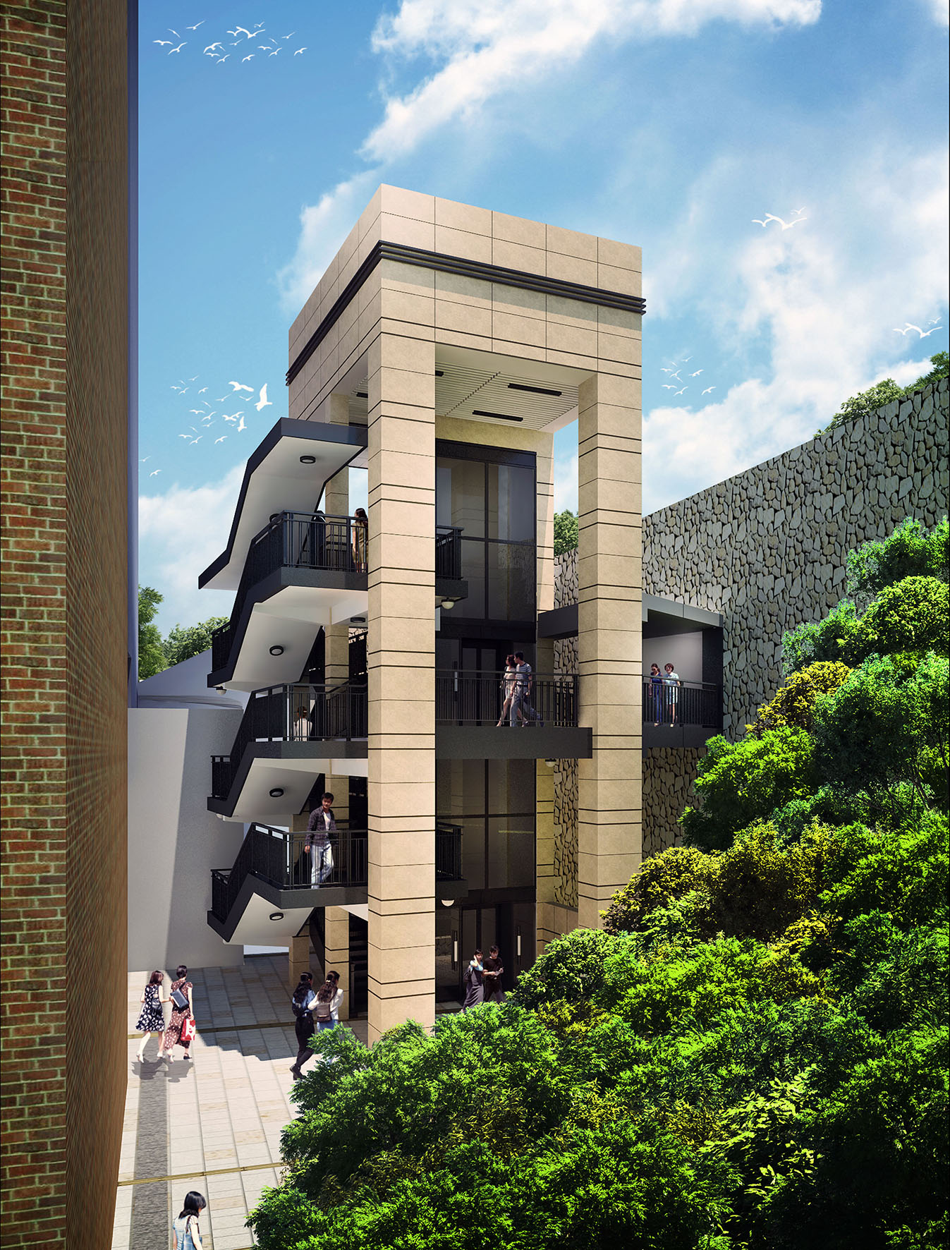 A execução da estrutura principal da obra compreende nomeadamente a modificação da escada localizada no Pátio do Túnel e o acréscimo de elevadores equipados com botões de comando com diferenciação táctil e sistema de alerta sonoro, facilitando assim a deslocação das pessoas de terceira idade ou portadoras de deficiência motora, bem como a execução de via pública no tardoz da Escola Pui Tou para prolongamento da Rua da Encosta, de modo a incrementar o uso das vias envolventes. A par disso, será ainda realizado o embelezamento dos acessos viários e a estabilização do talude, no troço compreendido entre a Estrada de S. Francisco e a Avenida do Dr. Rodrigo Rodrigues até o Colégio Santa Rosa de Lima, de modo a repavimentar os passeios com os azulejos com anti-derrapantes e com diferenciação táctil para orientação de pessoas portadoras de deficiência visual.