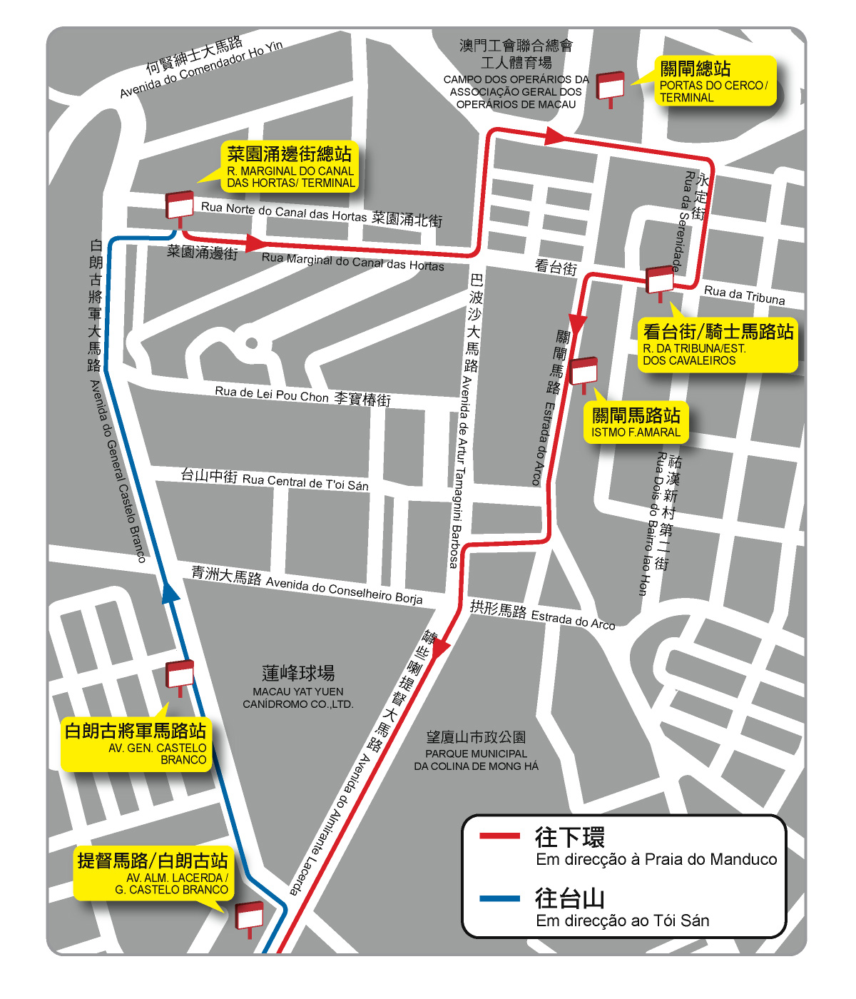 Na sequência da abertura do troço no Bairro Tamagnini Barbosa da Avenida do General Castelo Branco e da Rua Lei Pou Ch’ôn, para aliviar a pressão do trânsito na Avenida de Artur Tamagnini Barbosa e Istmo de Ferreira do Amaral, entre outras vias envolventes, e aumentar a frequência de partidas mediante a aceleração da rotatividade com recurso à via recentemente aberta, as carreiras n.os 16 e 25X que circulam inicialmente por estas vias serão ajustadas. Neste âmbito, a carreira n.o 16 circula pelo percurso inicial e passa a parar na paragem “Avenida do Almirante Lacerda/Castelo Branco”, depois de fazer escala na paragem “Ouvidor Arriaga/Sagrado Coração” e deixa de circular pela Avenida de Artur Tamagnini Barbosa e Avenida do Comendador Ho Yin, passando a fazer escala na paragem “Avenida do General Castelo Branco” antes de chegar ao Terminal da Rua Marginal do Canal das Hortas. A carreira n.o 25X que se dirige para a Taipa, depois de partir do “Terminal das Portas do Cerco”, passa a parar nas paragens “Edifício dos Serviços Comunitários da UGAMM” e “Castelo Branco/Canídromo” e segue o percurso inicial deixando de fazer escala nas paragens “Rua da Tribuna/Estrada dos Cavaleiros”, “Istmo Ferreira do Amaral” e “Jardim Triangular”; a mesma carreira que se dirige no sentido das Portas do Cerco deixa de passar pela Avenida de Artur Tamagnini Barbosa, passa a circular na Avenida do General Castelo Branco, e volta ao Terminal das Portas do Cerco, depois de fazer escala no “Terminal da Rua Marginal do Canal das Hortas”, cancelando as paragens “Mercado Toi San” e “Avenida de Artur Tamagnini Barbosa”.