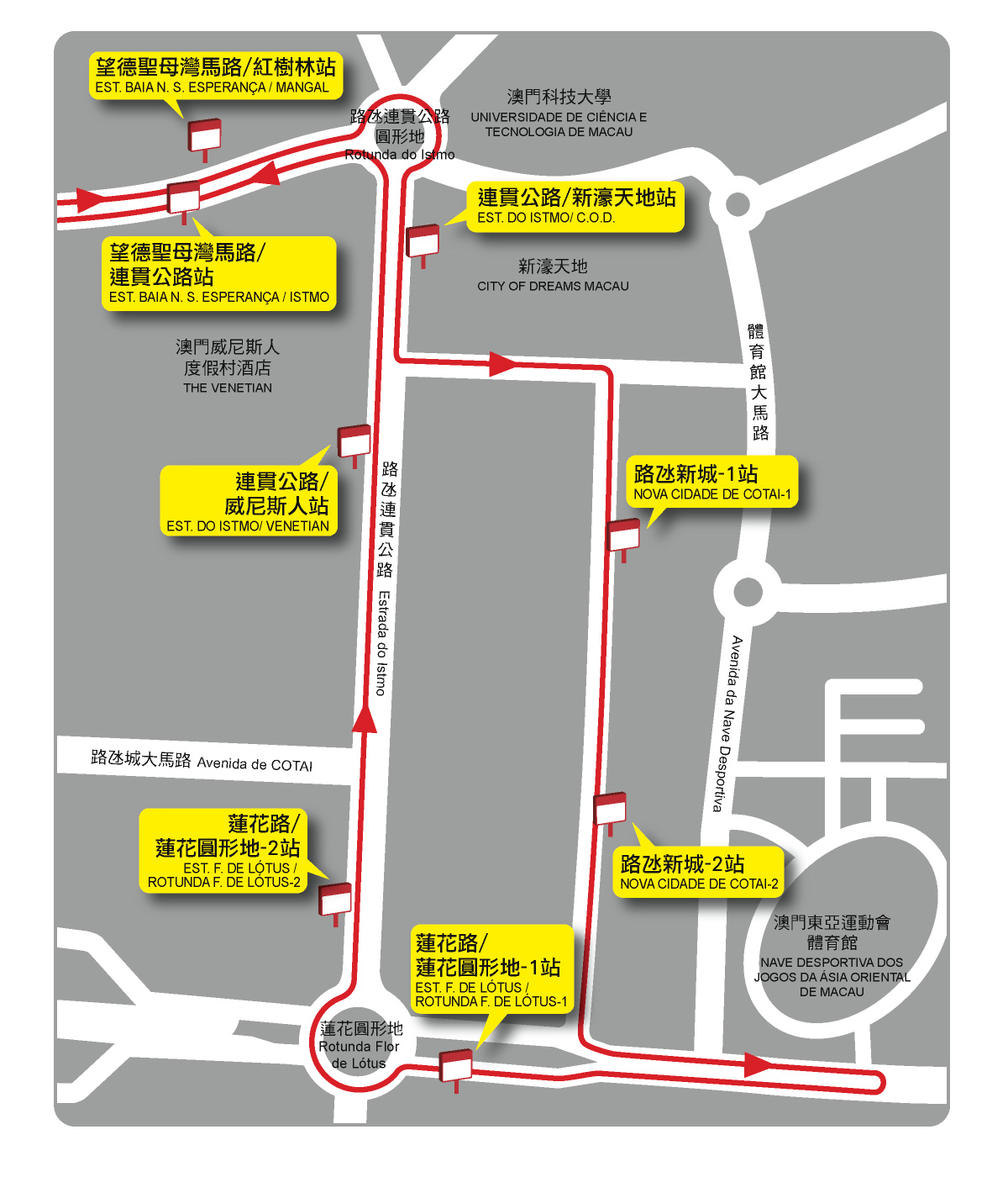 Entretanto, para aumentar a taxa de cobertura das carreiras de autocarros, a carreira n.o 25X vai ser ajustada e passa no novo troço de via do COTAI (compreendido entre o Istmo Taipa-Coloane e Avenida do Estádio, i.e por detrás do Sands COTAI Central), assim como terá duas paragens novas “COTAI-1” e “COTAI-2”, para facilitar o acesso dos cidadãos àquela zona. Após o ajustamento, a carreira n.o 25X não faz escala nas paragens “Istmo Taipa-Coloane/Sands Central” e “Rotunda de Flor de Lótus-1”, passando a parar nessas duas novas paragens e na paragem “Estrada de Flor de Lótus/Rotunda de Flor de Lótus”.