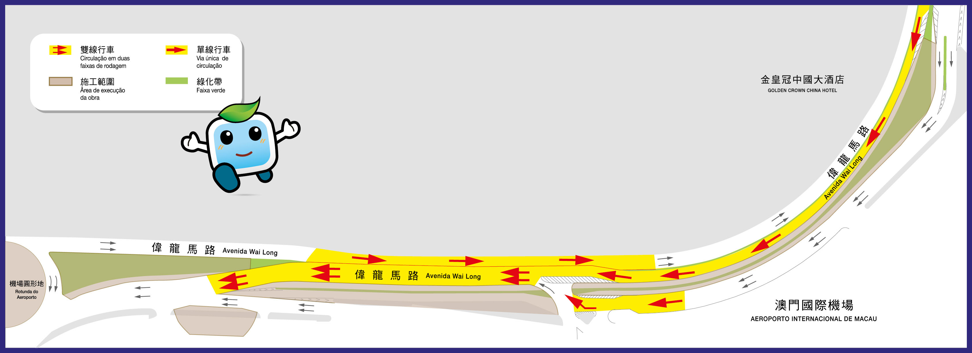 Ultimamente, foi removida a faixa verde na Avenida Wai Long pelo GIT para que seja aumentado o espaço disponível na rodovia, altura em que foi desenvolvida, em paralelo, a transferência das tubagens enterradas de modo a reduzir o tempo de execução, visando, assim, minimizar os impactos à mobilidade dos cidadãos. Com os respectivos procedimentos quase a ser concluídos, o âmbito de execução vai estender-se. A partir dos meados de Abril, o troço junto da Aeroporto Internacional de Macau em direcção à Universidade de Ciência e Tecnologia de Macau vai estreitar-se para uma via de circulação, sendo, porém, mantidas duas vias viárias no troço do lado do sul do Aeroporto onde se encontra o parque de estacionamento. Para além disso, o troço, passando pela Universidade de Ciência e Tecnologia de Macau para a Rotunda de Pak On, passa a ser uma via de circulação. Em conjugação com a vedação experimental e os condicionamentos provisórios de trânsito atrás referidos, o GIT e a DSAT elaboraram os folhetos para distribuir aos cidadãos nas imediações das habitações, do posto de gasolina e dos organismos de prestação de serviços sociais da Taipa.