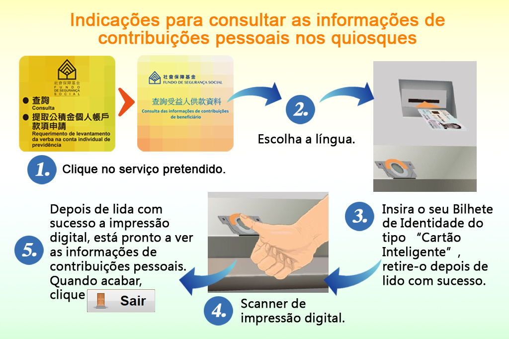 Basta que os beneficiários do regime da segurança social tragam, apenas, o seu BIR do tipo de cartão inteligente para a utilização dos quiosques automáticos quando consultam os registos de contribuições, sendo muito fácil o método de utilização: clique, no ecrã, em “Consulta das informações de contribuições de beneficiário” e escolha a língua; de seguinte, insira o BIR do tipo de cartão inteligente, registe a impressão digital conforme a instrução dada no ecrã. Quando identificada com sucesso a impressão digital do beneficiário, no ecrã vai mostrar-se o seu registo de contribuições nos últimos dois anos, incluindo o nome de empregador, a data de contribuições efectuadas bem como o número de meses totais de contribuições, entre outras informações. O beneficiário, depois de ler as informações, pode clicar em “Sair” para voltar à página principal.