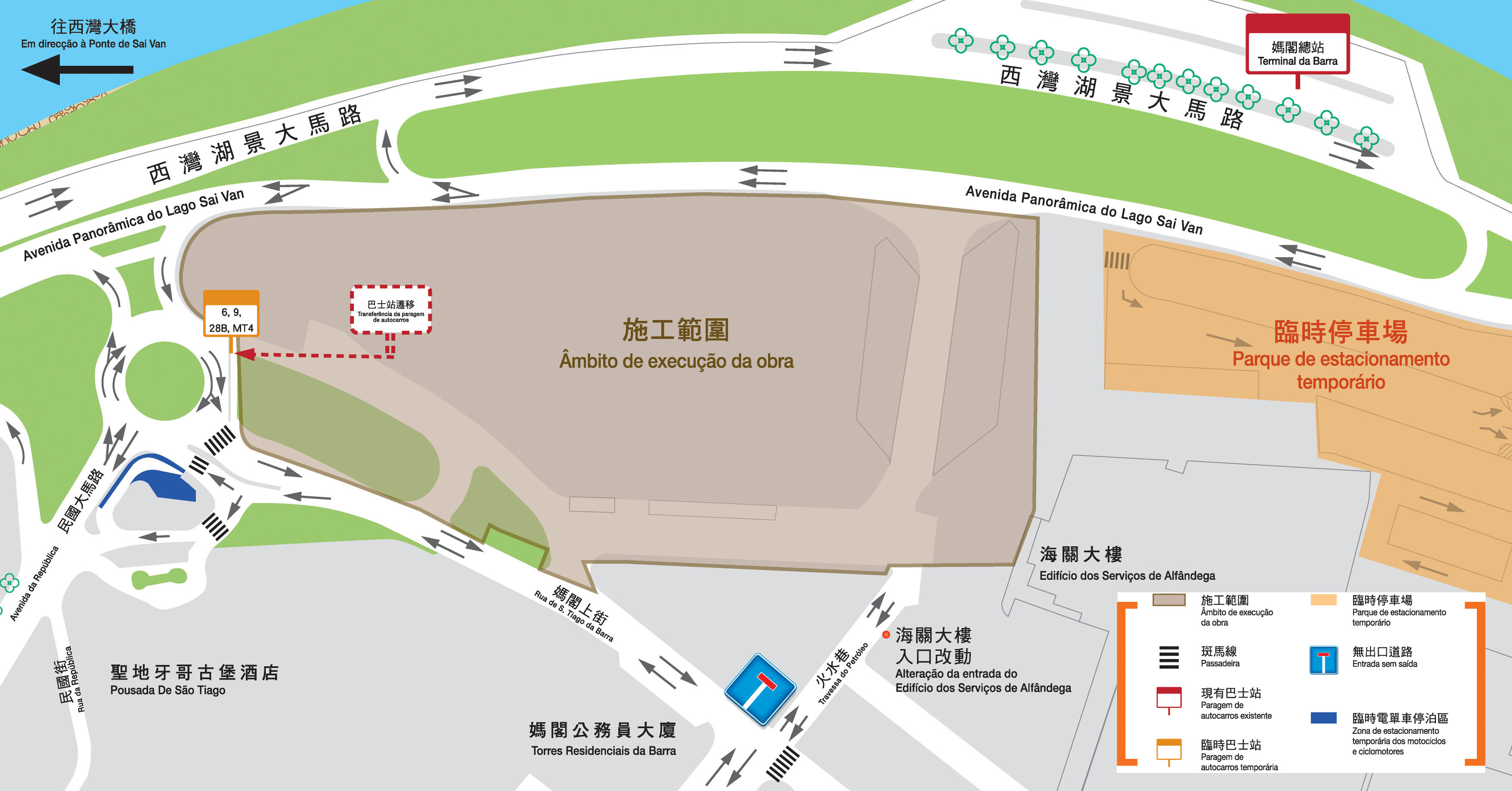 Com vista a reduzir os impactos aos utentes da via desta zona, resultando da tomada das medidas acima referidas, os empreiteiros procederam, ultimamente, ao ajuste duma parte da faixa verde, localizada na Rua de S. Tiago da Barra de modo a aumentar o espaço da rodovia. Por outro lado, continuar-se-á a aplicar as medidas provisórias de trânsito qaunto à restrição da circulação dos autocarros turísticos com o comprimento mais de 8m pela Rua de S. Tiago da Barra, e será aberto o Auto-Silo, de natureza provisória, na Avenida Panorâmica do Lago Sai Van, onde dispõe totalmente dos 90 lugares disponíveis para os automóveis ligeiros e pesados e os motores, no sentido de atenuar a pressão rodoviárias desta zona.