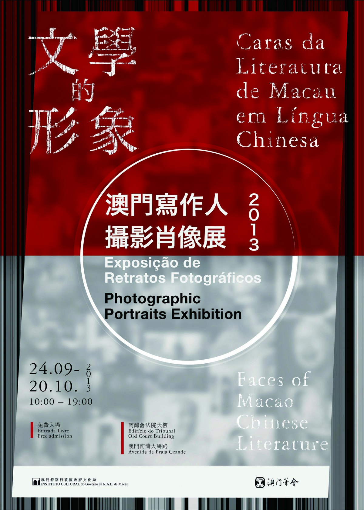 O Instituto Cultural e a Associação dos Escritores de Macau co-organizam “Caras da Literatura de Macau em Língua Chinesa – Exposição de Retratos Fotográficos”, cuja cerimónia de inauguração terá lugar no dia 23 de Setembro de 2013, pelas 18:30 horas, no Edifício do Antigo Tribunal, sito na Avenida da Praia Grande. Esta exposição tem como objectivo apresentar aos cidadãos o êxito dos escritores de Macau e mostrar a trajectória do desenvolvimento literário local.