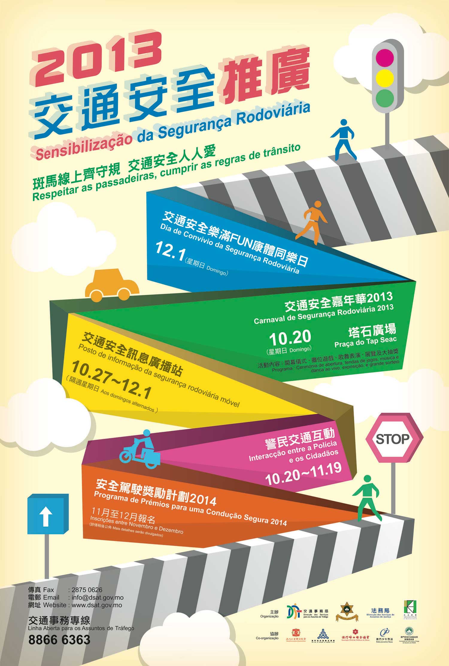 É bem-vinda a participação da população nestas actividades. Para mais informações, consulte a página da DSAT www.dsat.gov.mo ou telefone para 8866 6363, Linha Abertas para os Assuntos de Tráfego.